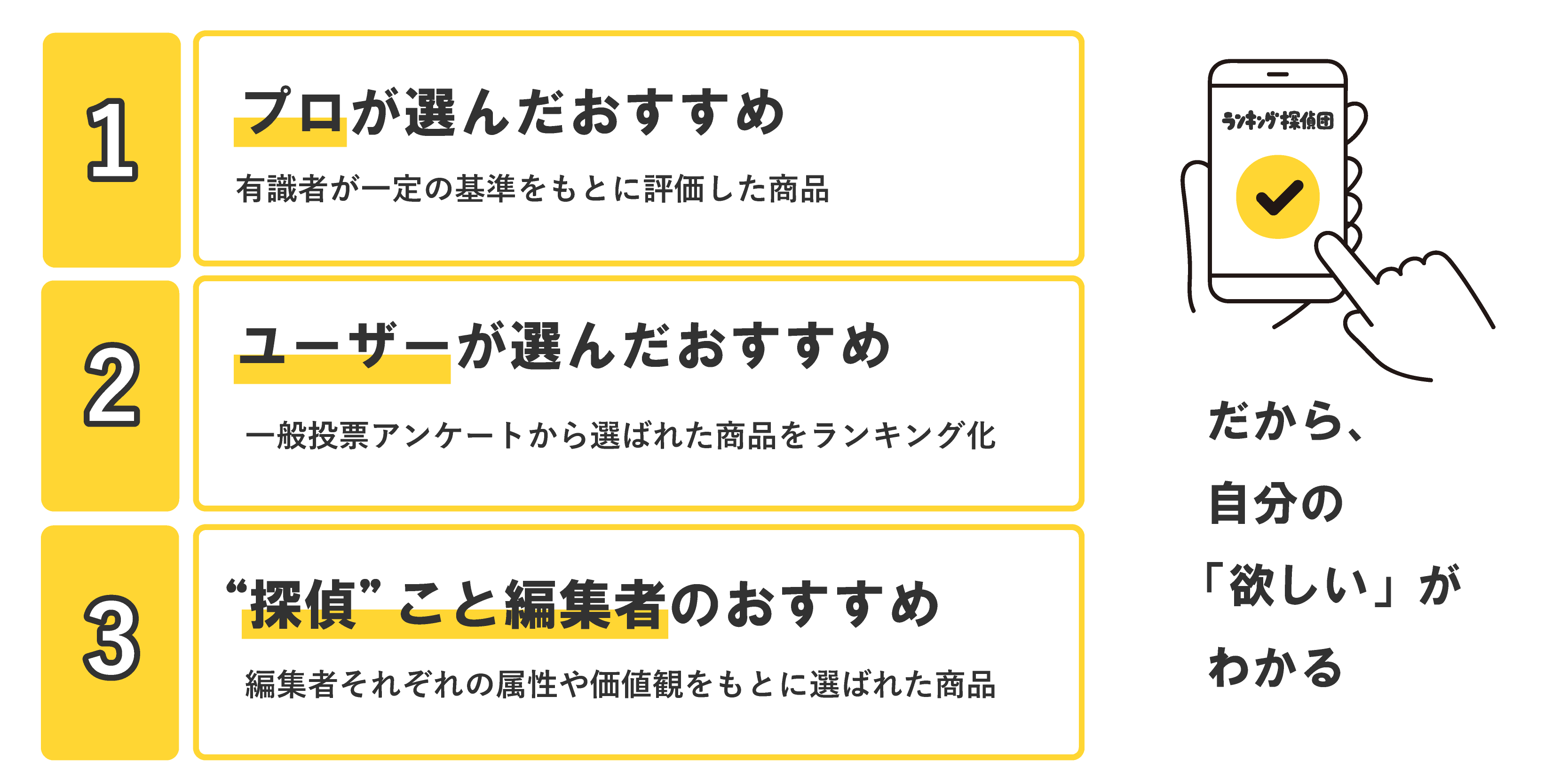 ネット上にある膨大な数の商品から自分に合ったモノやサービスが選べるよう、一般ユーザーのアンケートや有識者の見解、編集者の徹底調査の3つの視点で「おすすめ」の商品をご紹介します。