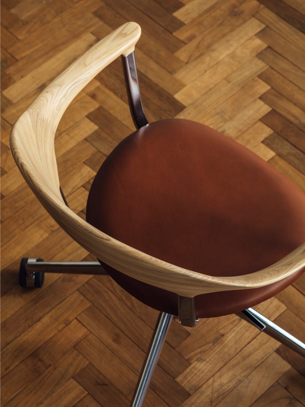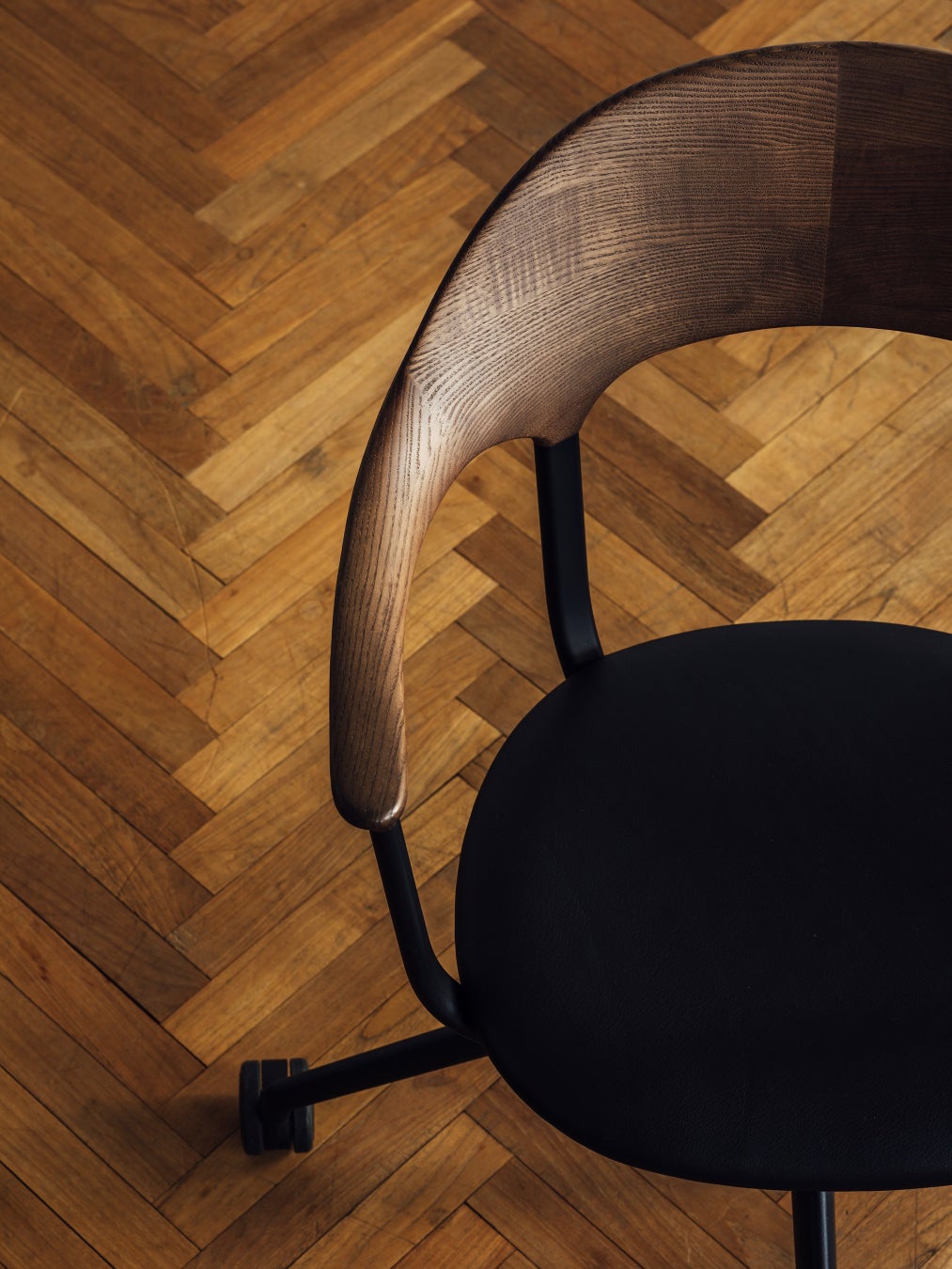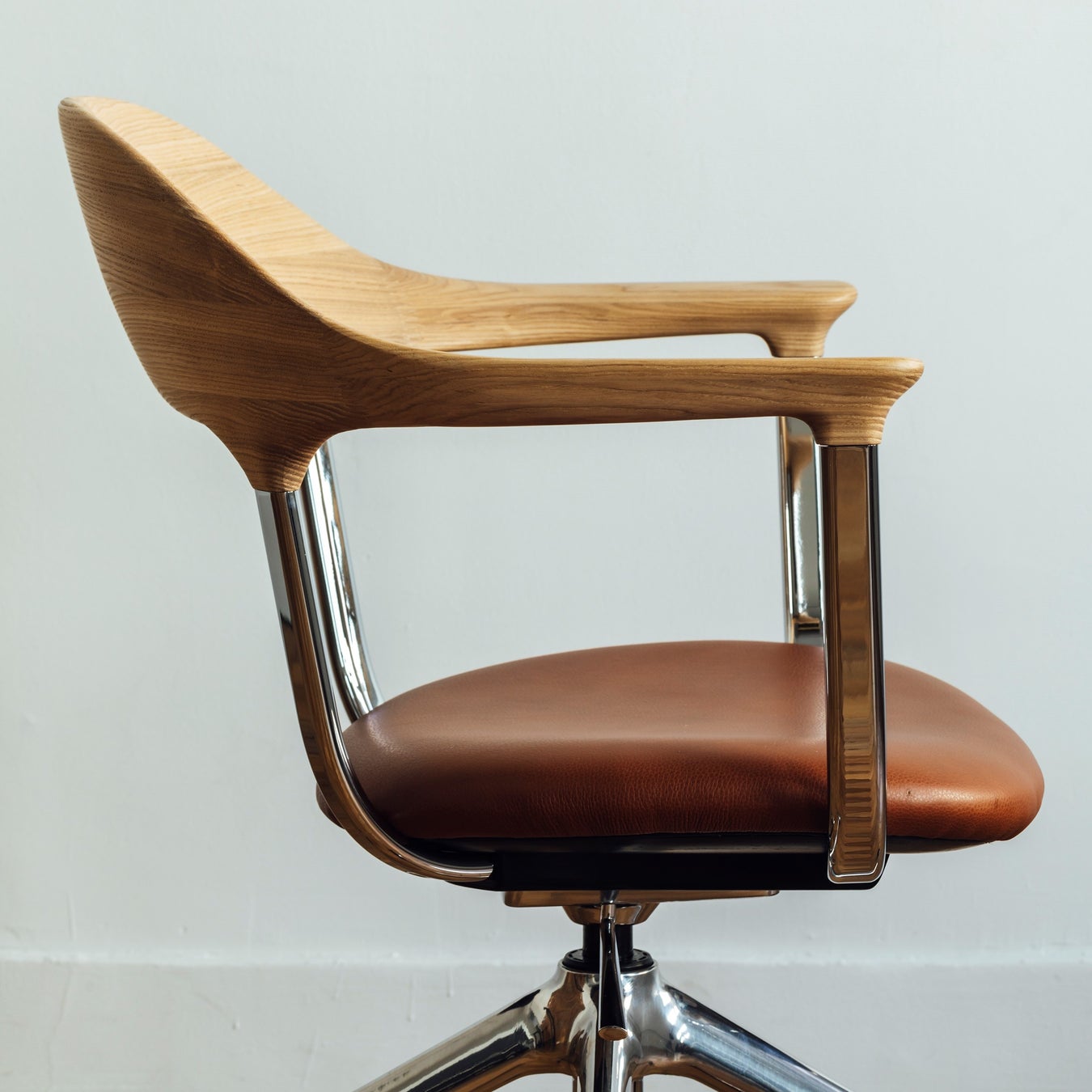 FOURチェアは北海道産タモの無垢材を使った笠木部分のカラーがナチュラル、ミディアムブラウン、ブラックの3色、フレーム部分はクロームメッキ仕上げのシルバーとマット感のあるブラックの2種類をご用意し、いずれもホームユースを意識し、プライベート空間のインテリアとの調和を考えた仕様となっています。そして、プロダクト単体でのフォルムの美しさだけではなく、テーブルと合わせた際に上から見える円弧を描く背もたれの佇まいにはワーキングチェアの要素を感じさせない優美さがあります。また、キャスター付きの脚部も現在主流となっている5本脚に対して、複数並んだ時や、空間全体を引いて見た際にうるさくないように4本脚のシンプルな構造を採用いたしました。