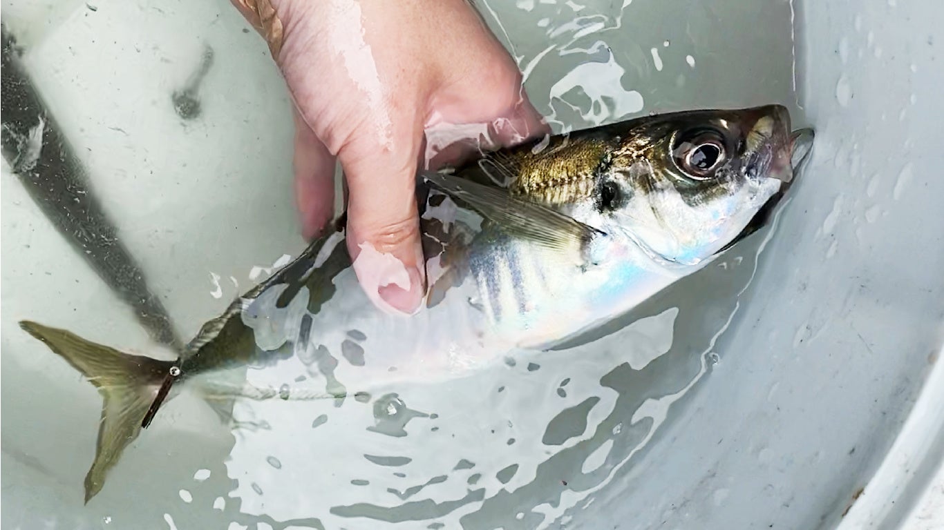 水深は10m前後で、ボールを2個から3個使ってから、底の方に集魚剤が漂ったのかよく釣れた。隣でサビキをしていた人が一度に上げるのが1匹か2匹の中、こちらはかなりの確率で3連・4連上がり、釣果もよかった。(40代 男性)