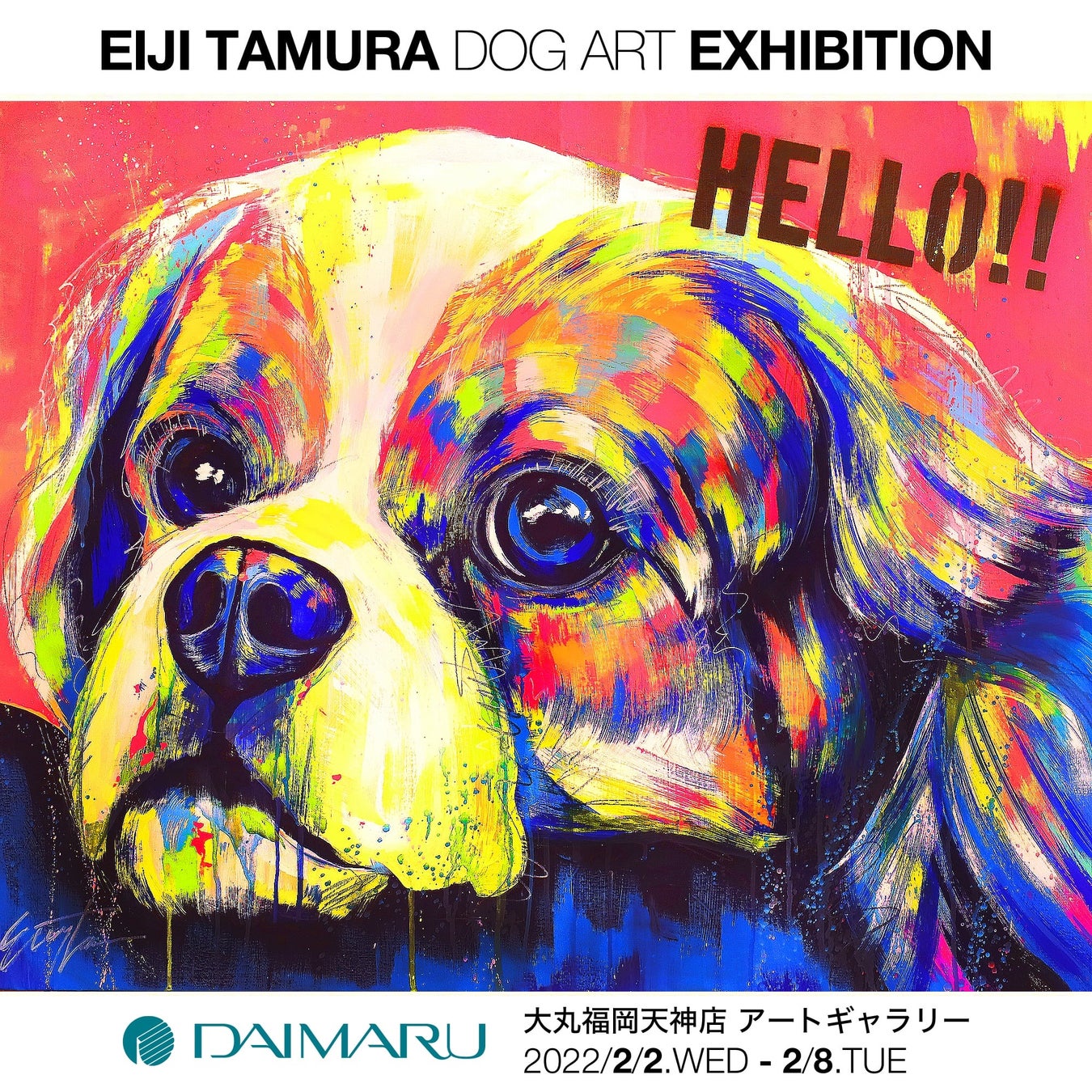 日本各地やニューヨークなど国内外で活躍するDOG ARTISTのEIJI TAMURA(田村英史・タムラエイジ/所在地:東京都渋谷区)は、2022年2月2日(水)~2022年2月8日(火)10:00~20:00(最終日:18時まで)、大丸福岡天神店 本館6階アートギャラリーにて、EIJI TAMURA DOG ART展を開催いたします。(*新型コロナウイルスの影響により、変更する場合がございます。)