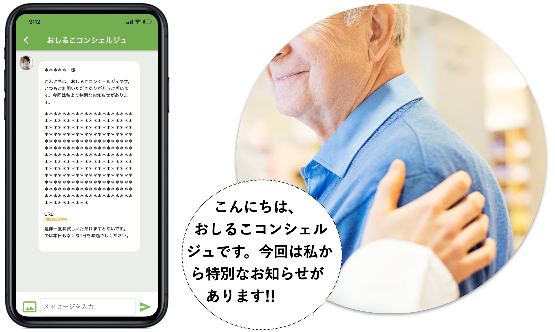 「自らが『良い』と感じたモノ・コトはみんなに伝えたがる」というシニアの特性を活かし、口コミで商品をPRする方が効果的である事から、おしるこ内でユーザーとの信頼関係を構築しているコンシェルジュを活用したサービスとなっております。