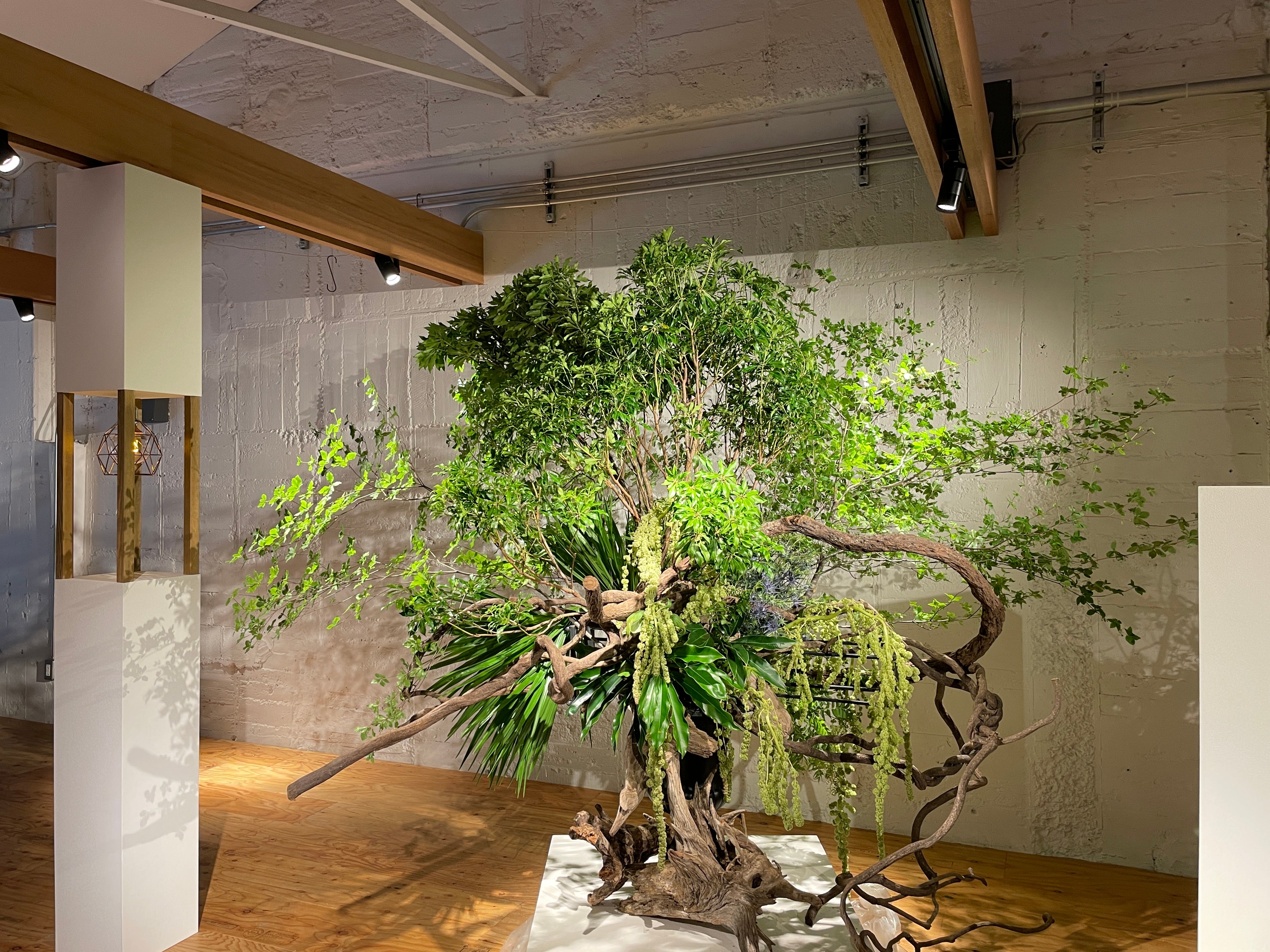 例えば、まず会場へ入る入り口の階段をオリジナルジャンボフラワーで埋め尽くし、ご来場の瞬間からワクワクするエントリーを。そして、会場の中央には天井から大きな木が逆さに生え、そこにはさまざまなミニアートの実がなっており、ご来場者が自分の手でアートを選んで木からもぎ取りお求め頂けるシステムに。