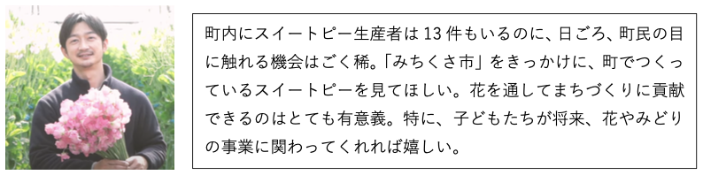 町内にスイートピー生産者は13件もいるのに、日ごろ、町民の目に触れる機会はごく稀。「みちくさ市」をきっかけに、町でつくっているスイートピーを見てほしい。花を通してまちづくりに貢献できるのはとても有意義。特に、子どもたちが将来、花やみどりの事業に関わってくれれば嬉しい。
