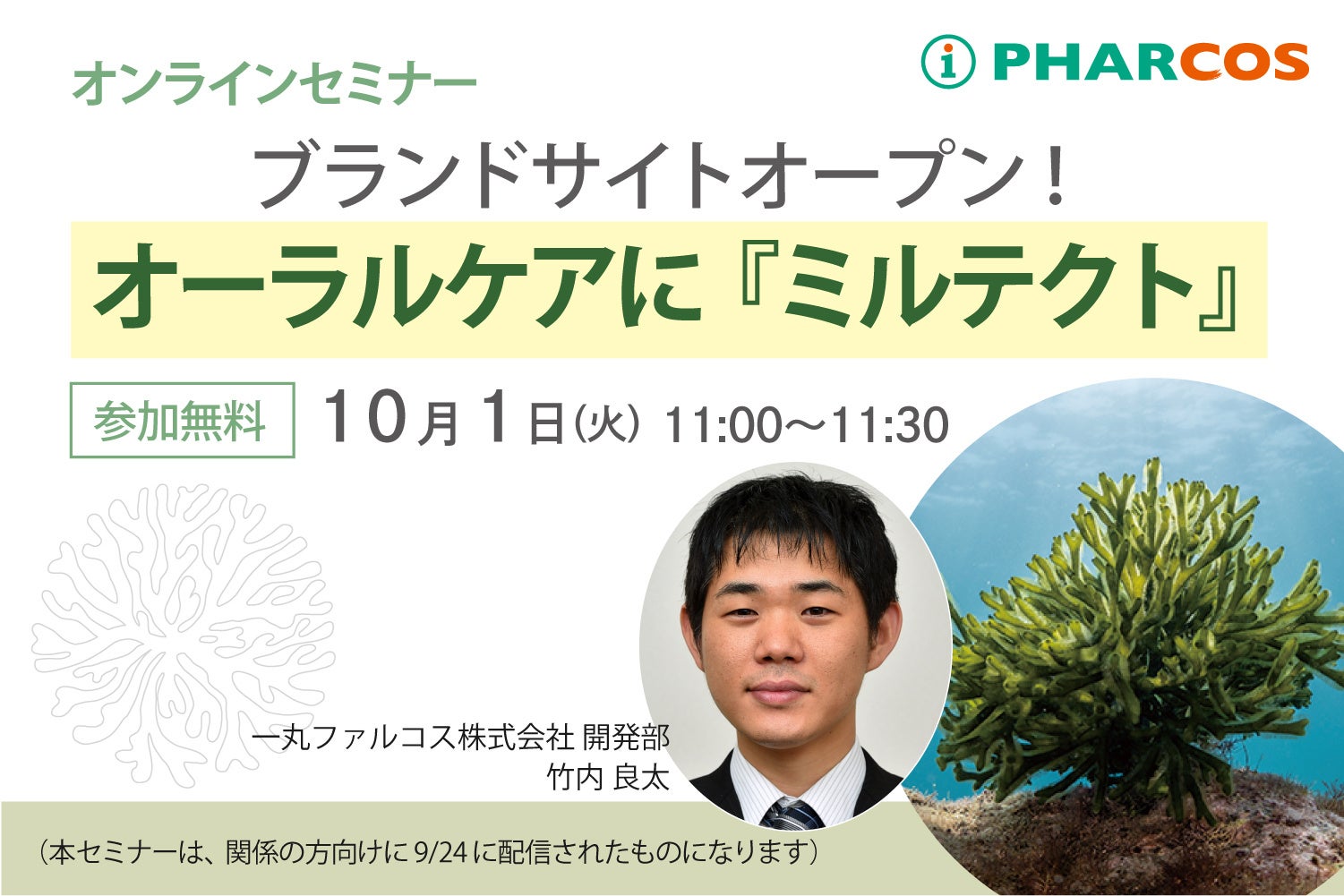 一丸ファルコス株式会社(本社:岐阜県本巣市、代表取締役社長:安藤芳彦)は、2024年10月1日に「海藻由来・天然オーラルケア原料・ミルテクト®」をテーマとした無料セミナーを実施します。ミルテクトは、海藻・ミル(海松)Codium fragileより抽出された天然オーラルケア原料で、S. mutansなどの初期付着菌の歯面への吸着を阻害し、バイオフィルムの形成を抑制する作用が期待される素材です。セミナーではミルテクトの概要からオーラルケアを取り巻く環境、新しく公開するミルテクト専用サイトをご紹介します。