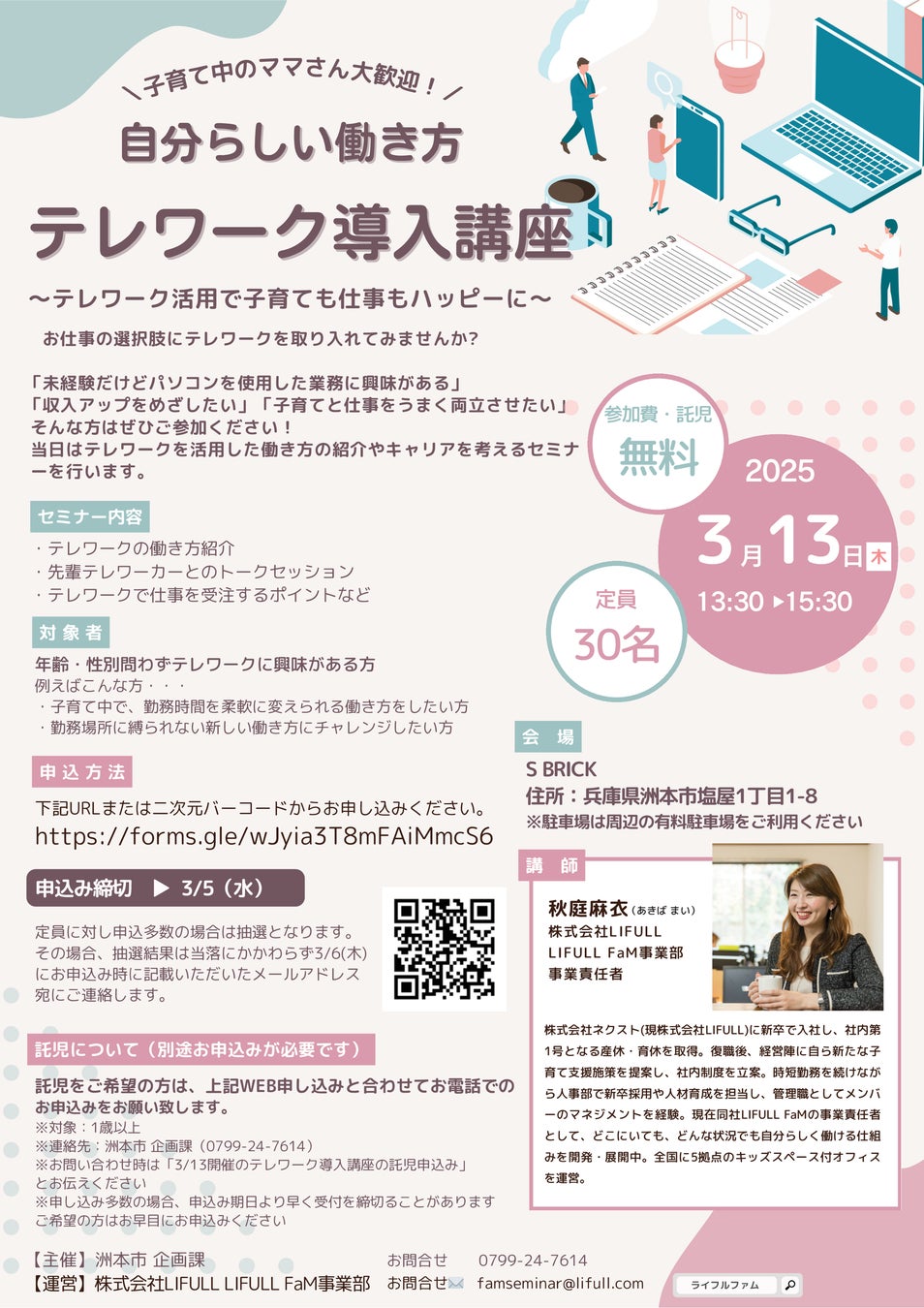 2025年3月13日、兵庫県洲本市は『自分らしい働き方 テレワーク導入講座』を開催いたします。講座等の取組によって、若年女性が住みやすい街を目指します。