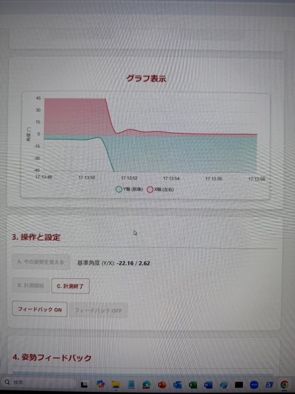 ・ウォッチ画面上にY軸・X軸の角度変化を折れ線グラフで可視化。時系列での姿勢の変化を視覚的に把握できる機能を備えています。