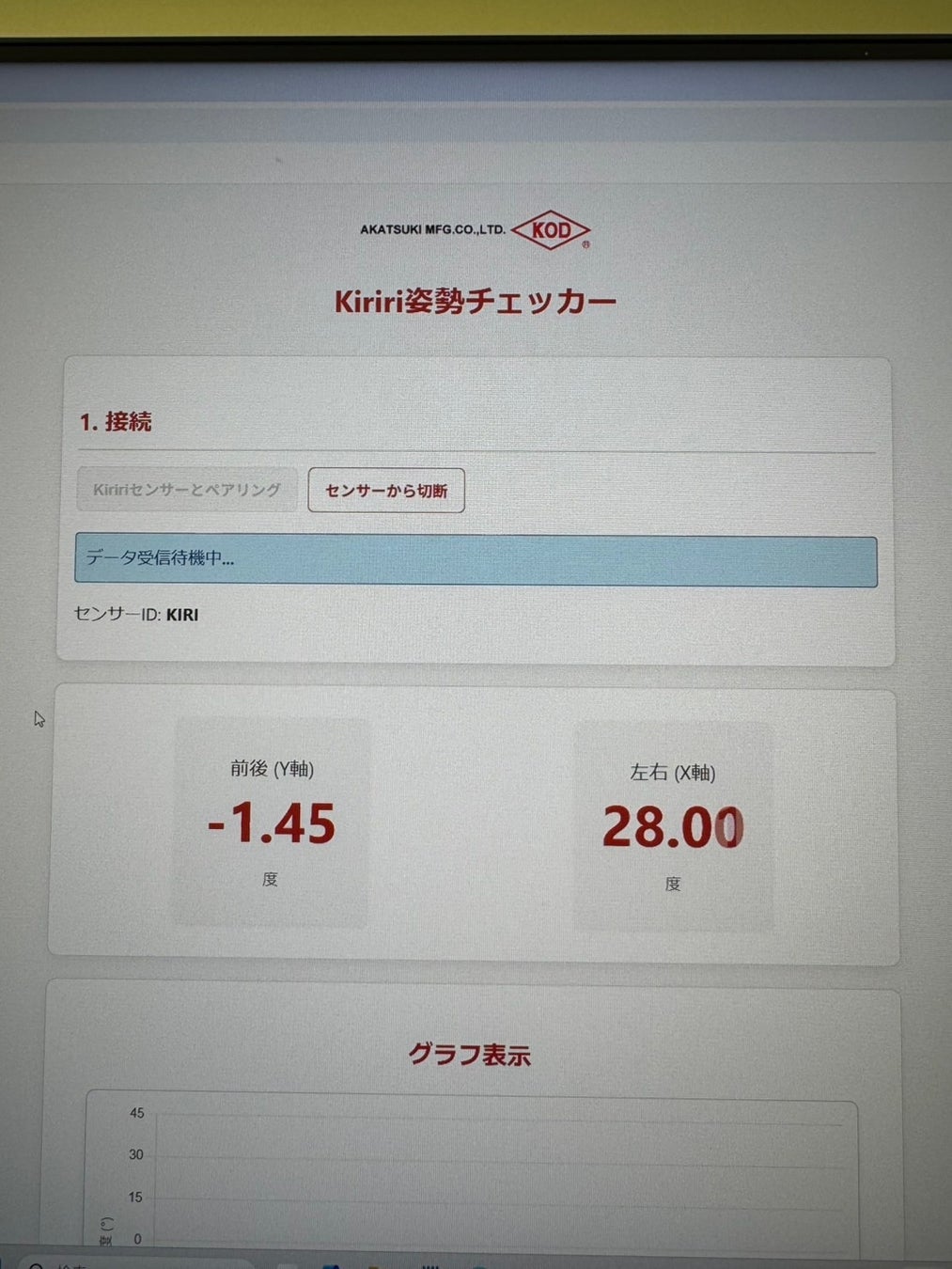 Wear OS対応アプリに加え、Webアプリケーション(タブレット/スマートフォン版)でもKiririセンサーとの接続を可能とし、リアルタイムの角度表示、フィードバック、グラフ表示などウエアラブルデバイスとしての機能を最大限に活かしたユーザー体験を提供します。