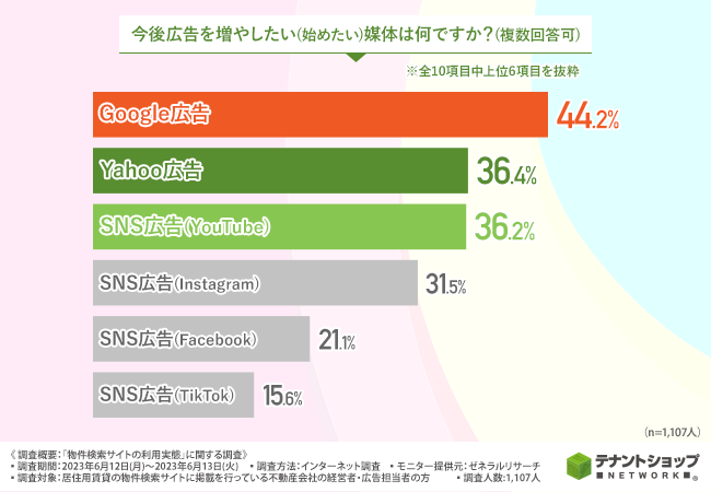 全員に、「今後広告を増やしたい(始めたい)媒体は何ですか?(複数回答可)」と質問したところ、『Google広告(44.2%)』と回答した方が最も多く、次いで『Yahoo広告(36.4%)』『SNS広告(YouTube)(36.2%)』と続きました。