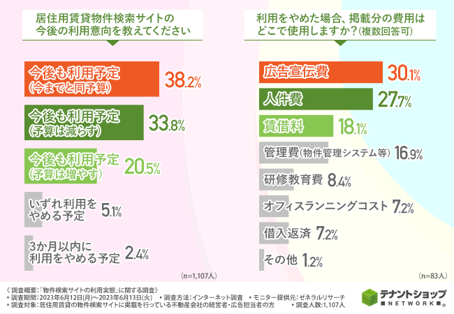 4割以上の企業は、コスパがよくない、反響が少ないといった理由で居住用賃貸物件検索サイトの予算を減らす、あるいは利用をやめる予定のようです。