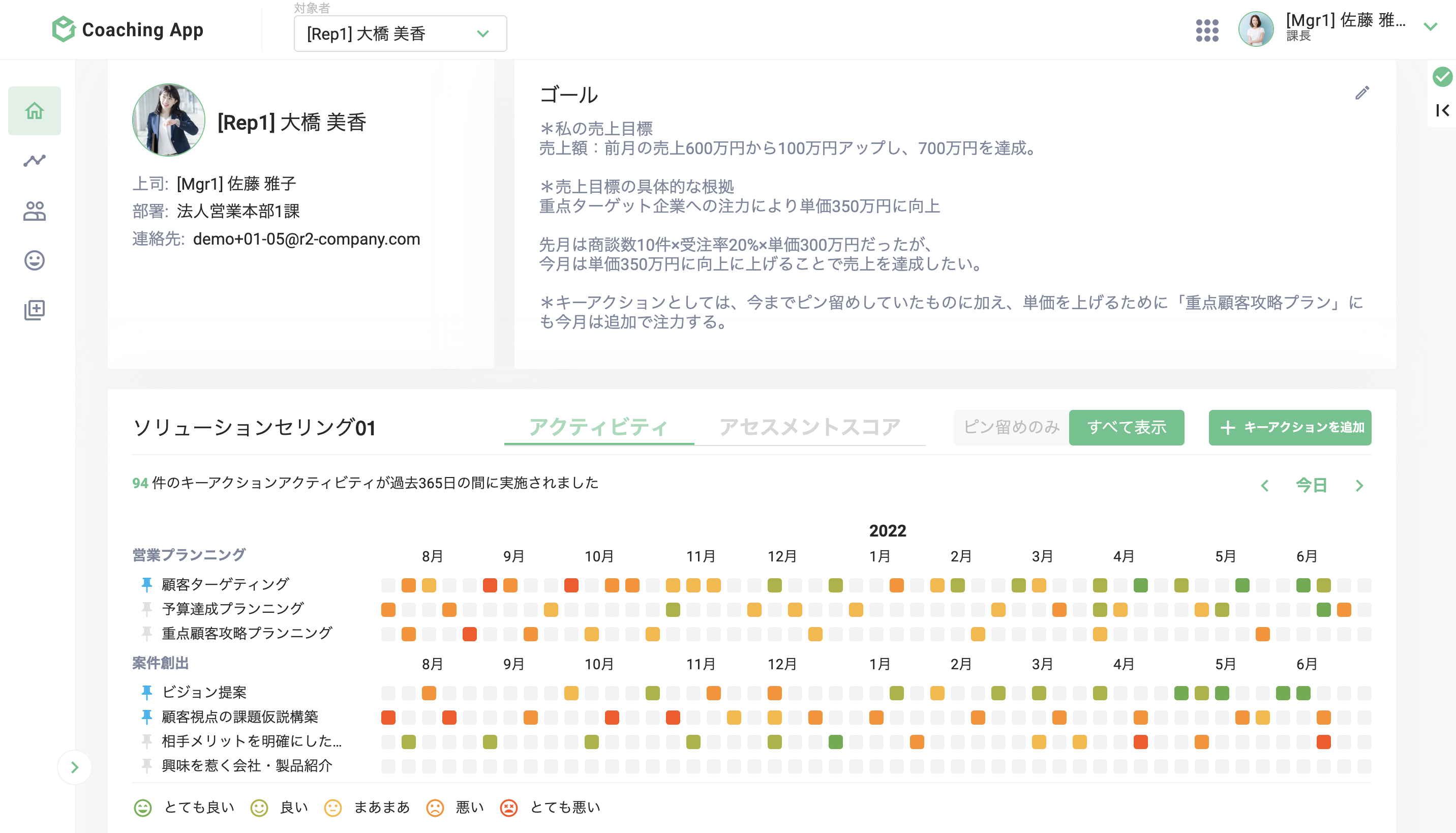 株式会社アールスクエア・アンド・カンパニー(本社:東京都千代田区、代表取締役社長:山下貴宏)は、営業育成の投資対効果を可視化するアプリ「Enablement App」において、営業マネージャーのマネジメント・部下育成に役立つ機能を強化し、営業パーソンの「行動変容の可視化」が実現したことをお知らせします。