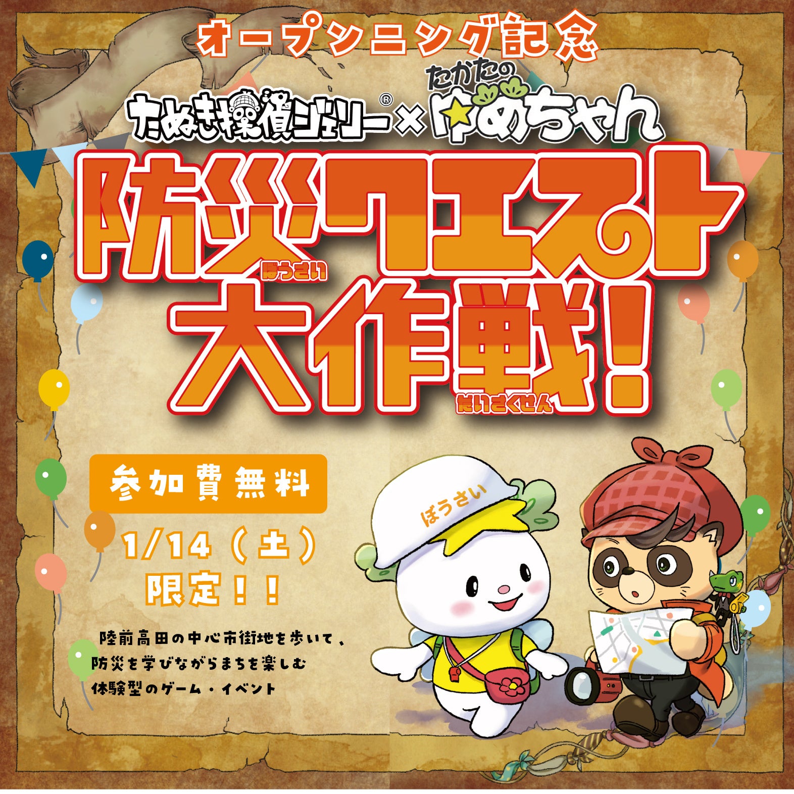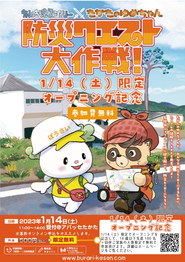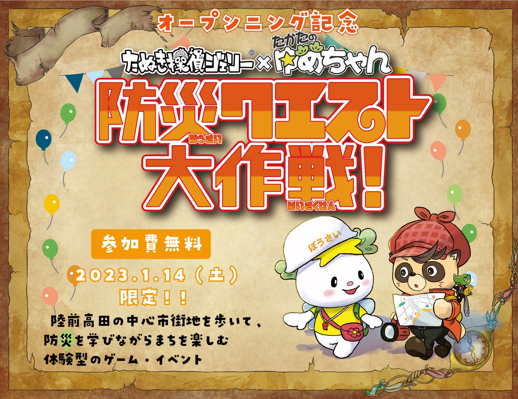 本コンテンツは東日本大震災で大きな被害を受けた岩手県陸前高田市において、謎解きを活用して防災を楽しく学びながら、中心市街地への店舗への回遊を実現し、経済効果を創出する取組となっており、1/14(土)当日にはオープニングを記念して、18歳以下の子供に対して100名限定で無料参加を提供します。