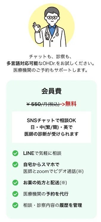 「セゾンの家賃保証」インターナショナルプランご契約者様は、「OHDr.多言語オンライン診療」の月額会員費550円(税込)が無償で提供されます。これにより、優待の期間中はオンライン診療の診察にかかる実費のみで、いつでも安心して本サービスをご利用いただけます。