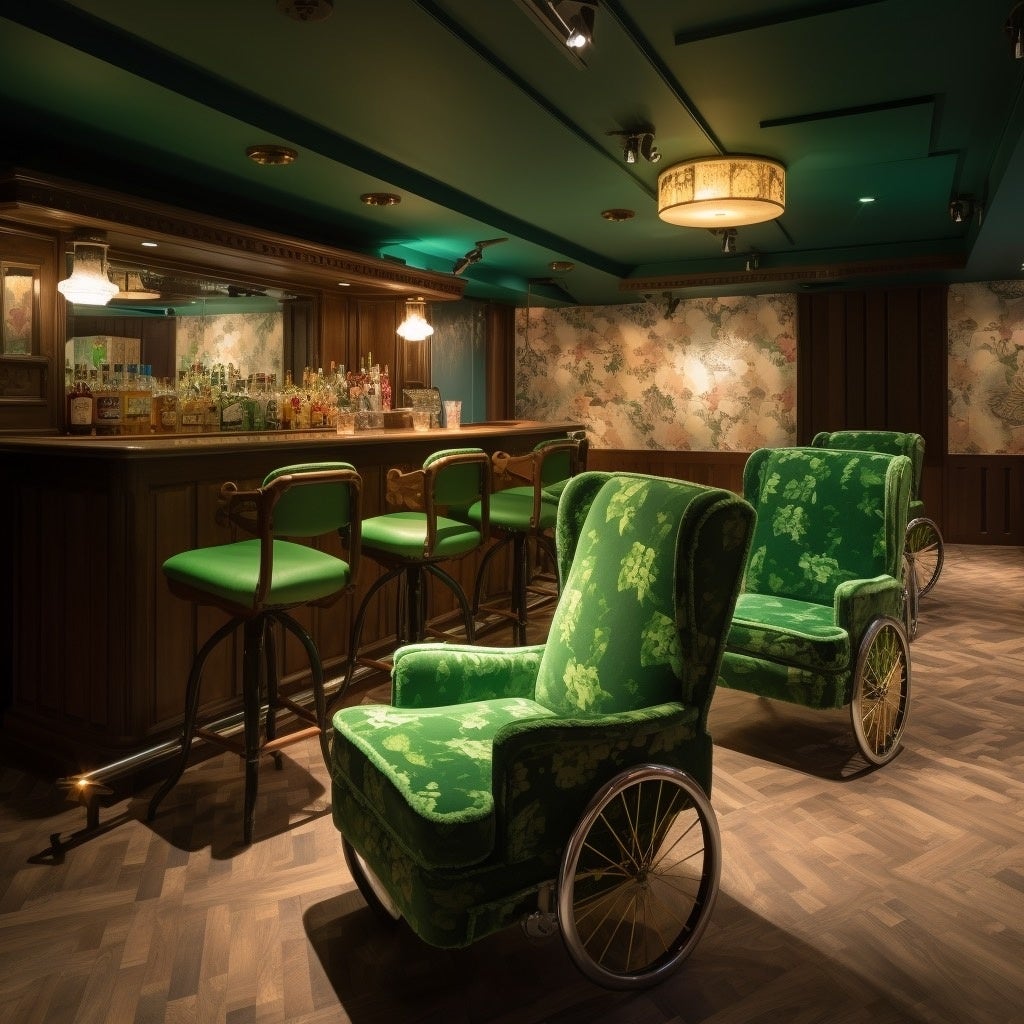 娯楽が充実した高齢者施設のプロデュースを目指す参加者が制作した「“ベロア車椅子”のある昭和系スナック」