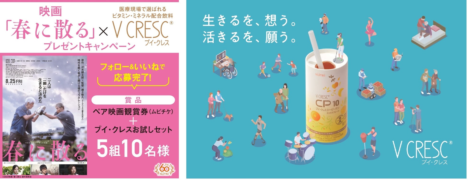 俳優 佐藤浩市さんと俳優 横浜流星さんのダブル主演で話題の映画「春に散る」は、一度夢を諦め渡米した元ボクサーと、一度はボクシングをやめた青年が、再びチャンピオンという夢に向かう“今この瞬間を生き切る”ストーリーです。ニュートリーの「ブイ・クレス」は、「生きる」を支えるサプリメントとして医療現場で選ばれ、またスポーツシーンなど、さまざまな世界のプロフェッショナルに活用されています。『生きるを、想う。活きるを、願う』を「ブイ・クレス」のブランドメッセージに込めたニュートリーは、“今この瞬間を生き切る”主人公たちの姿に共感し、キャンペーンを通じて映画「春に散る」を応援します。