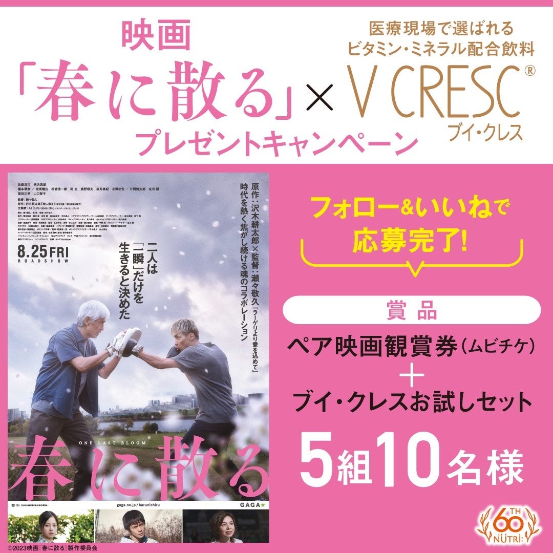ペア映画観賞券やビタミン・ミネラル配合飲料が当たる 映画「春に散る」×ブイ・クレス プレゼントキャンペーン ニュートリーshop公式Instagramにて8月18日~8月27日実施