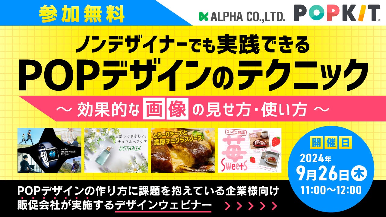 『伝える・伝わる・笑顔になる』をモットーに、株式会社アルファが販売促進活動を全面サポート。このセミナーでは商品やサービスを魅力的に見せるPOPデザインのコツを、ウェビナー形式でわかりやすく解説します。