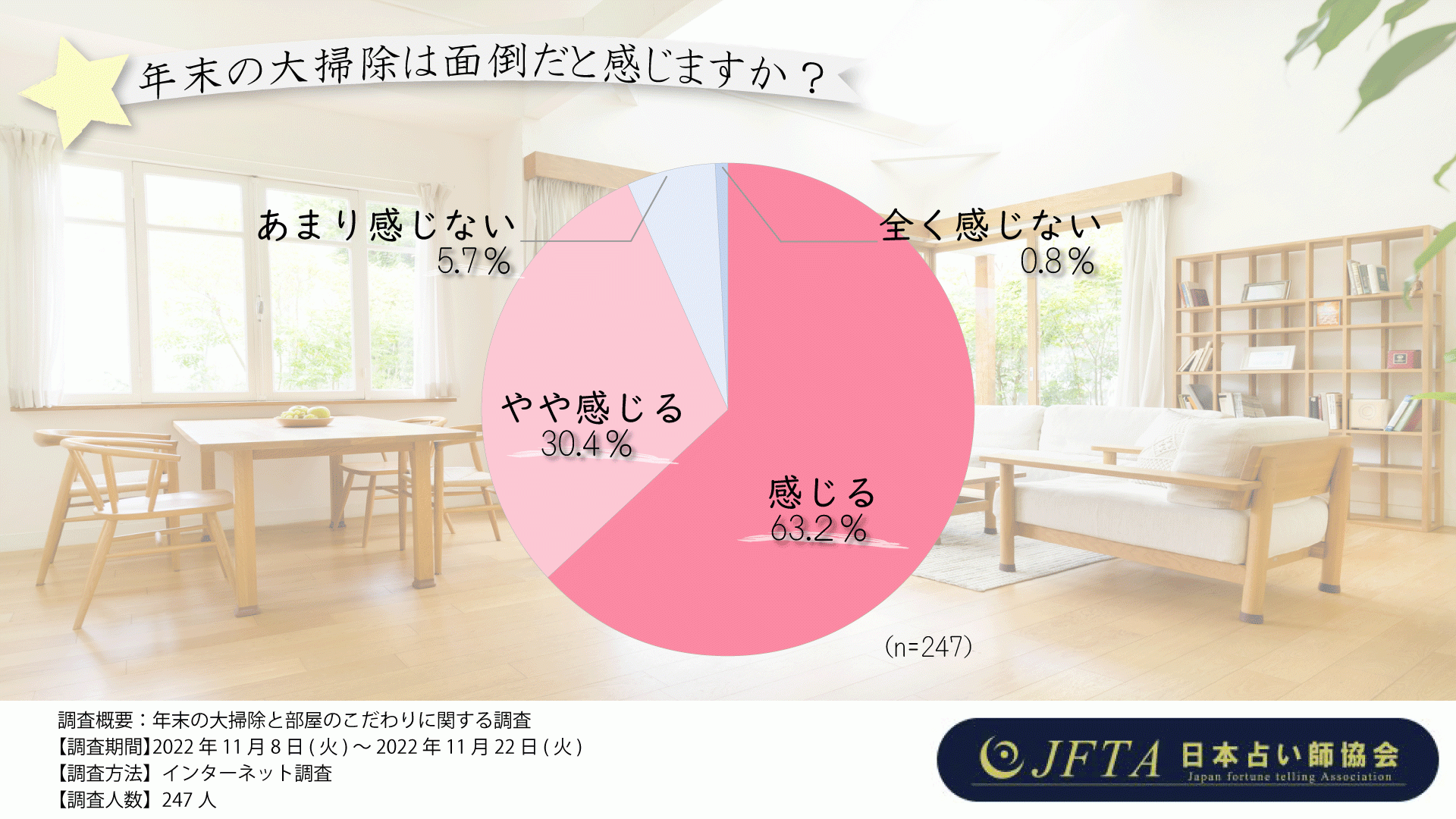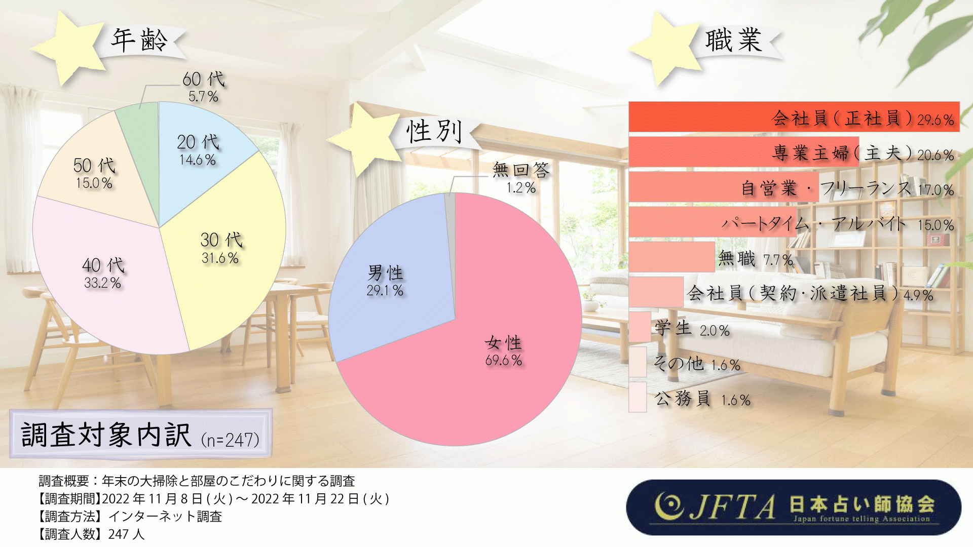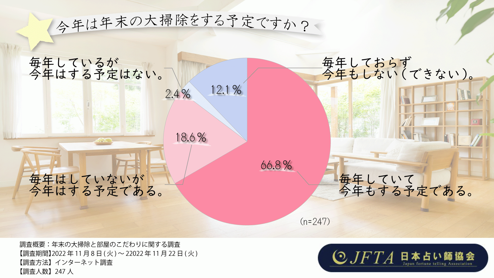 日本占い師協会(本社所在地:東京都中央区)は20代~60代の男女を対象に「年末の大掃除と部屋のこだわり」についての調査を実施しました。