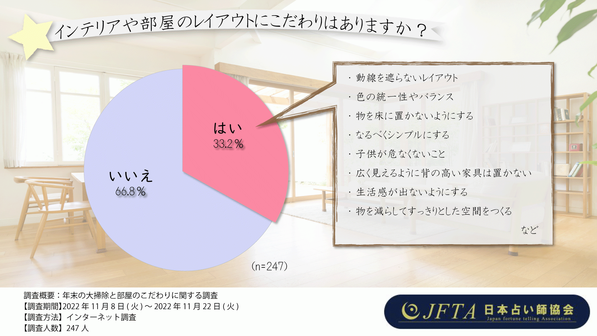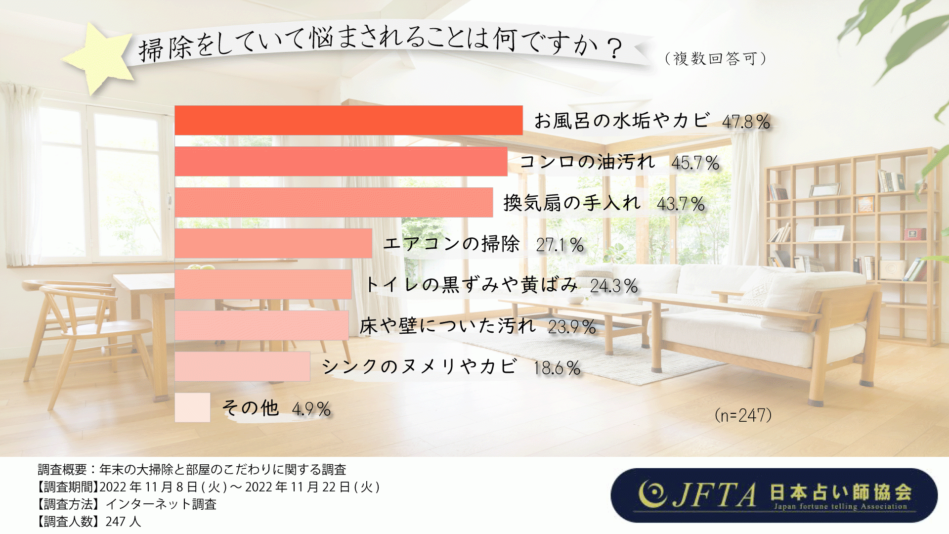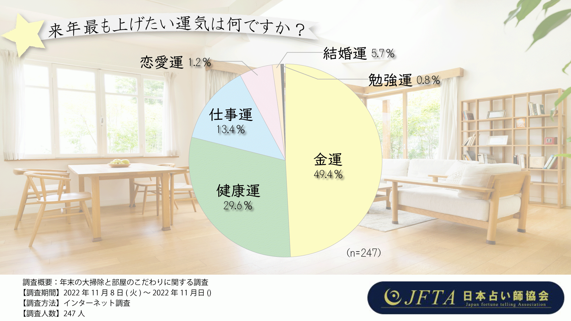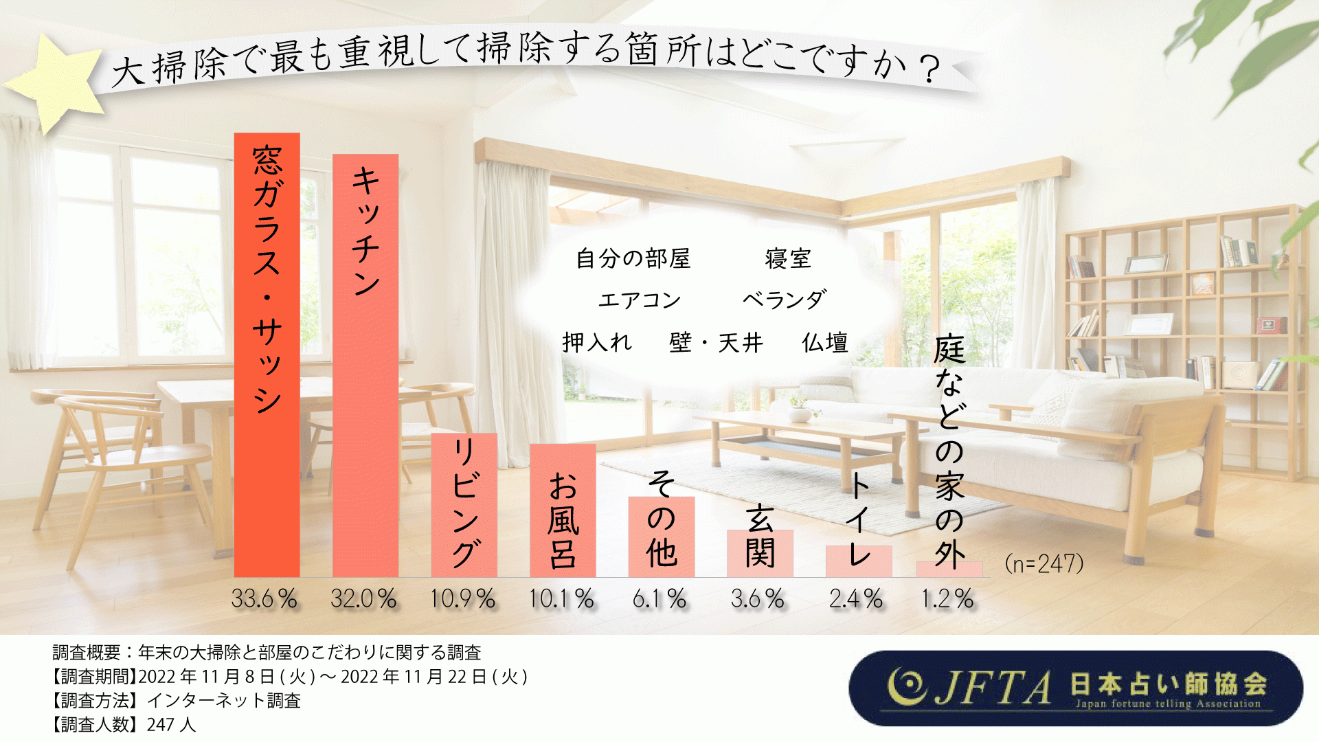 日本占い師協会(本社所在地:東京都中央区)は20代~60代の男女を対象に「年末の大掃除と部屋のこだわり」についての調査を実施しました。