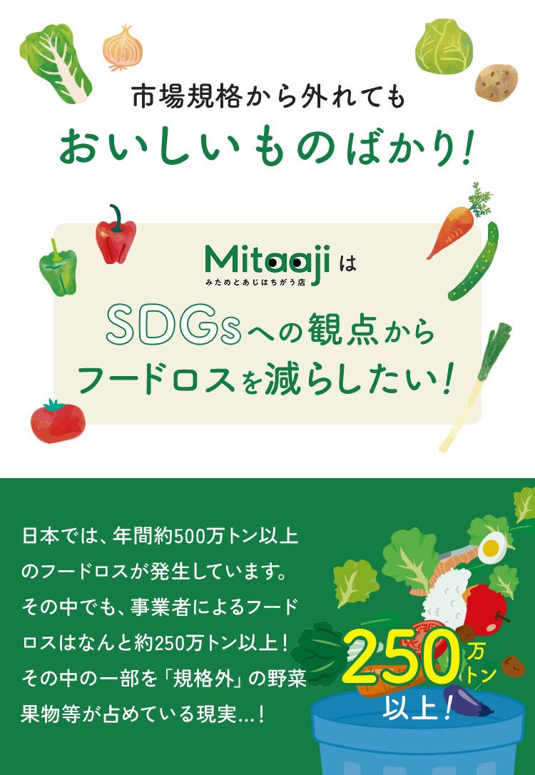 日本では、年間約500万トン以上のフードロスが発生しています。その中でも、事業者によるフードロスはなんと約250万トン以上。その中の一部を「規格外」の野菜果物等が占めている現実…「産地で出荷できない野菜・果物を積極的に取り扱い、厳選し皆様にお届けする」それが私たちのコンセプトです。