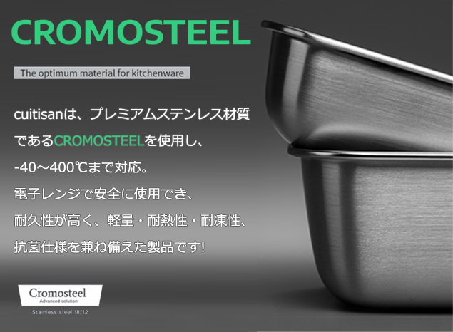 Cuitisanは、厳しいことで有名なドイツの検査機関TÜV Rheinland(ドイツ安全認証機関)で、安全性を認証されています。世界初のCromoSteelの特殊ステンレスを使用することで、従来にない画期的な機能を有した調理容器として、ヨーロッパのシェフや主婦たちの間で大人気となっています。