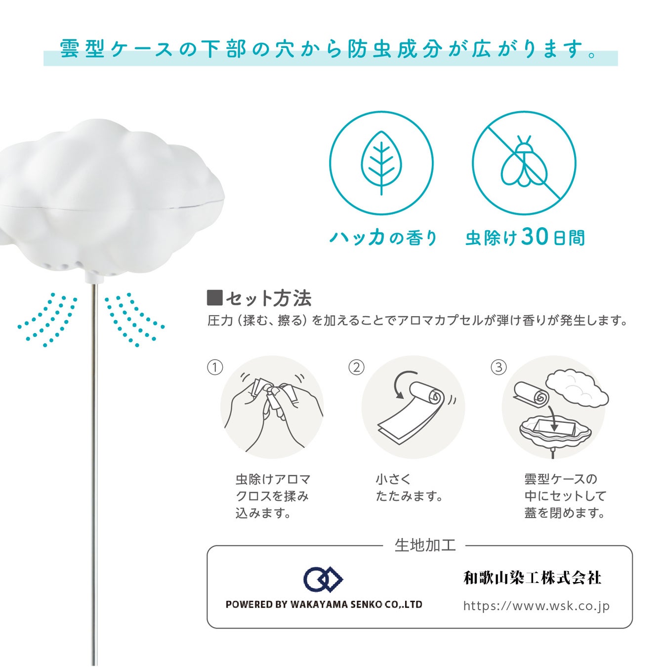 虫除け成分を染み込ませた布は、雲ピックの中に入れます。ケースの下に穴を開けることで香りを効率よく出すことができます。