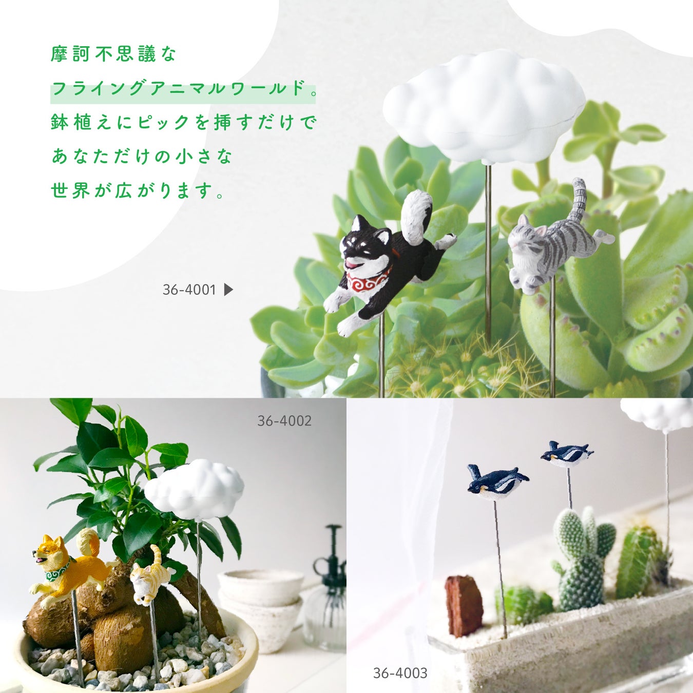 動物たちのピックをレイアウトすると、鉢植えの中に不思議なフライングアニマルワールドが生まれます。雲ケースには虫除け成分が含まれた布を入れることで、観葉植物を部屋に置いている人の悩みの一つであるコバエなどがたかるのを予防します。「楽しく虫除け」 できる、そんなガーデンピックです。
