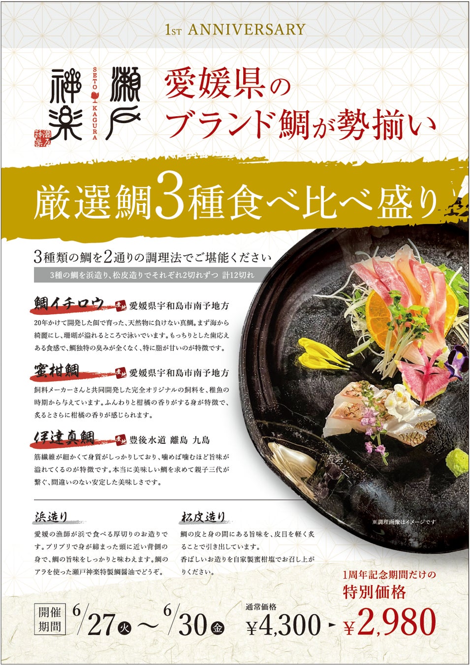 【瀬戸神楽1周年!】愛媛県産のブランド鯛が期間限定で6月27日から勢揃い!