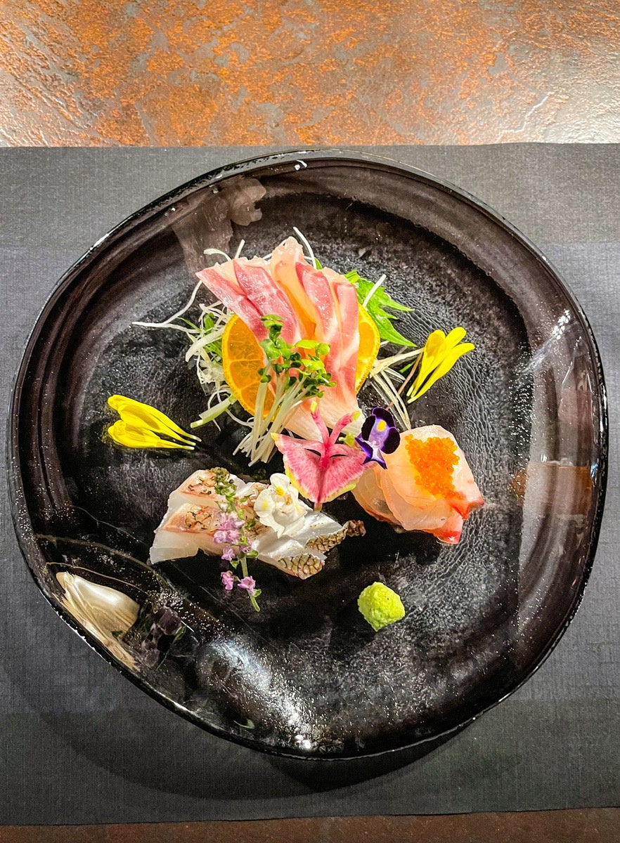 鯛の皮と身の間にある旨味を、皮目を軽く炙ることで引き出しています。香ばしいお造りを自家製の蜜柑塩でお召し上がりください。