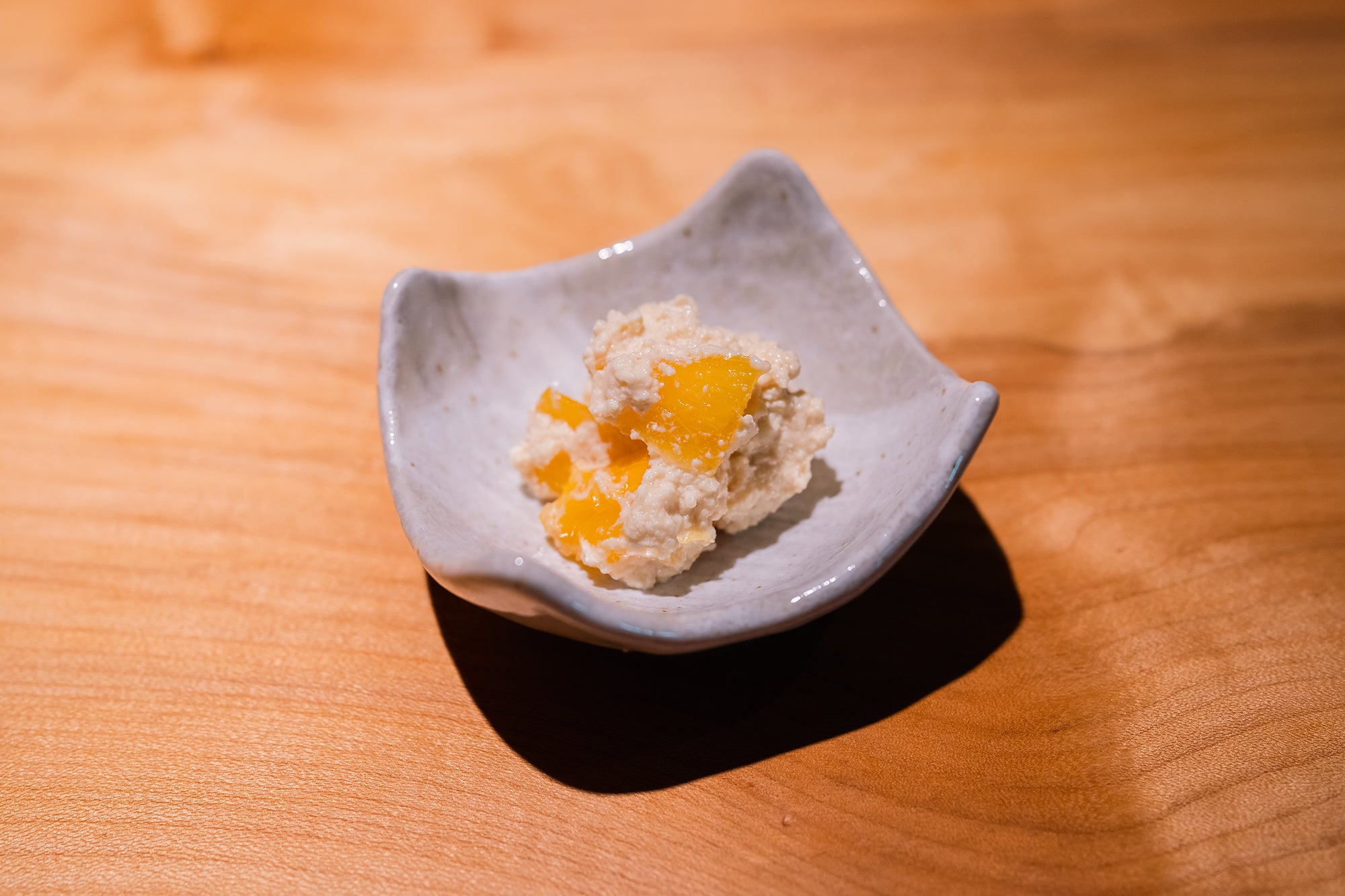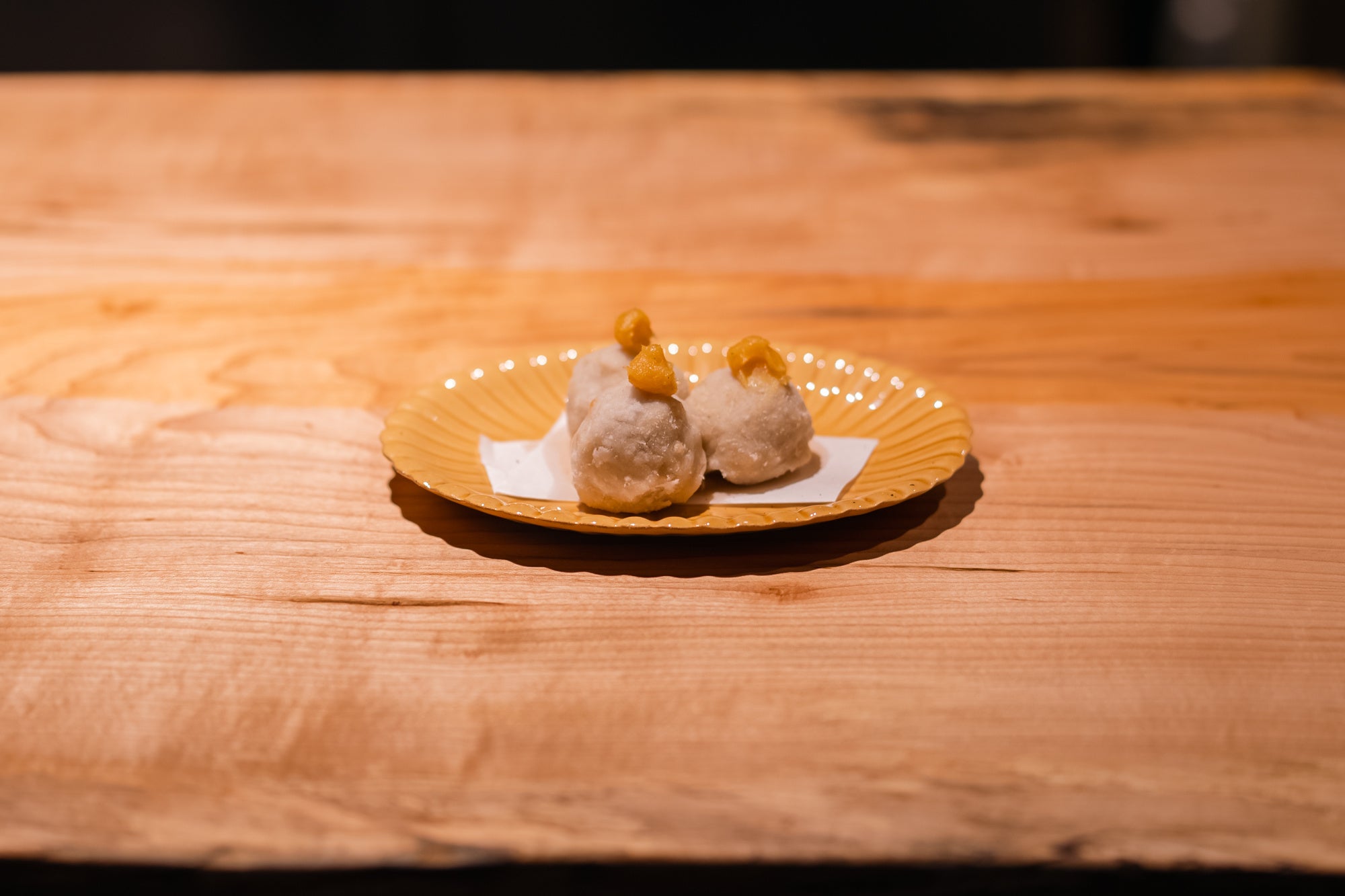 一度里芋を炊いてから丸めて揚げることで、中まで味わいが凝縮。さっくりとした表面とねっとりとした舌触りのコントラストが楽しい一品に。白味噌と卵を混ぜた玉味噌を上に乗せています。