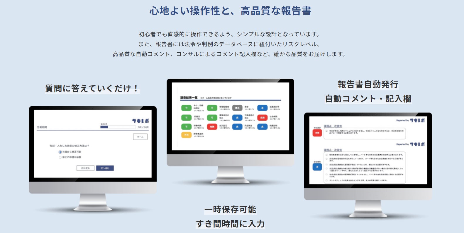 初心者でも直感的に操作できるよう、シンプルな設計となっています。また、報告書には法令や判例のデータベースに紐付いたリスクレベル、高品質な自動コメント、コンサルによるコメント記入欄など、確かな品質をお届けします。