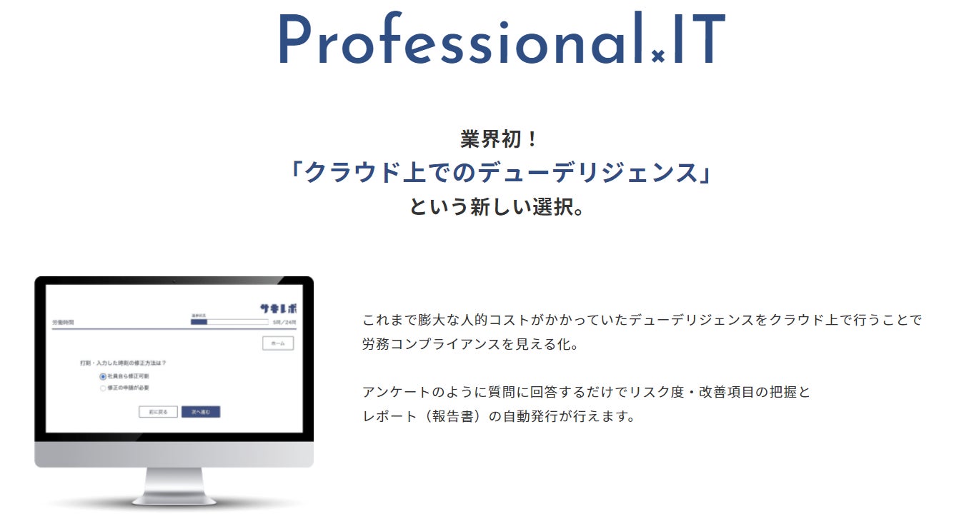 「サキレポ」は、これまで紙と人で行ってきた品質はそのままに、ネット上で気軽にリスク調査ができるクラウドデューデリジェンス®サービスです。これまで膨大な人的コストがかかっていたデューデリジェンスをクラウド上で行うことで労務コンプライアンスを見える化。アンケートのように質問に回答するだけでリスク度・改善項目の把握とレポート(報告書)の自動発行が行えます。(https://minamotoc.jp/sakirepo/)