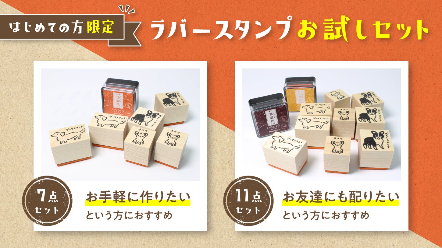 初めての方でも安心してご利用いただけるよう、スタンプの作り方などをわかりやすい動画で理解していただけるようにいたしました。また、「小ロットから試しに作ってみたい。」とのお声を多くいただき、初めての方でもお手軽にお試しいただけるよう初めての方限定でお試しセットをご用意しました。7点セット(スタンプ6個、スタンプ台1個)、11点セット(スタンプ9個、スタンプ台2個)の2種類をご用意していますので是非一度ご利用してください。