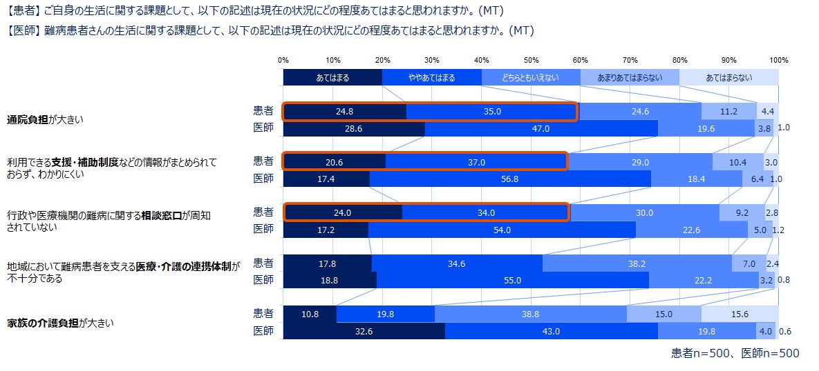 難病患者さんと医師それぞれに、生活支援における課題を尋ねたところ、難病患者さんの約6割が「通院負担が大きい(59.8%)」「行政や医療機関の難病に関する相談窓口が周知されていない(58.0%)」「支援・補助制度の情報がわかりにくい(57.6%)」など生活における課題を感じていることなどをはじめ、行政や医療機関の支援体制に課題を感じていることがわかりました。また、「家族の介護負担」については、負担を感じている方と感じていない方が二極化している傾向がみられました。