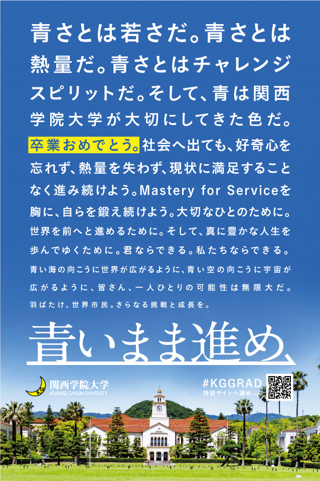 関⻄学院大学は、2022年度秋学期の卒業生に向けて贈るプロジェクト『青いまま進め』を実施します。本企画は、OB・OG、教職員から卒業生へのメッセージを募るだけでなく、卒業生からの喜びの声も集める、SNSを活用した参加型企画です。2023年3月17日(金)・20日(月)の二日間に卒業式を迎える総勢約5,000名の学生たちへのエールを込めたもので、本日3月10日(金)より、ハッシュタグ「#KGGRAD」で集まった投稿を特設サイトにて公開します。