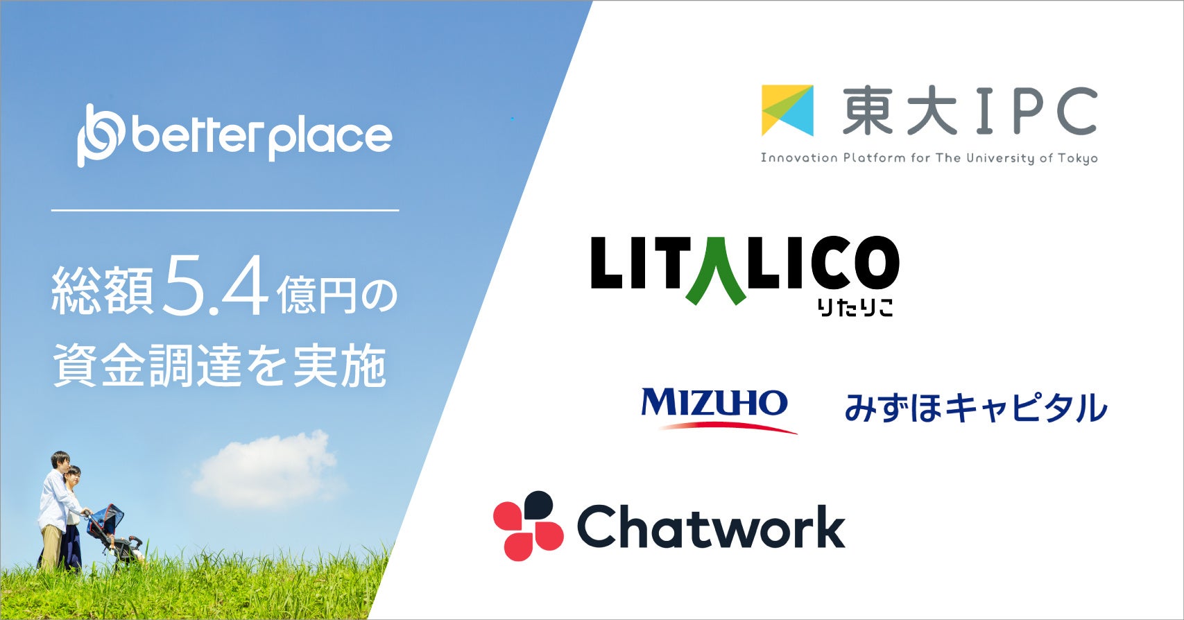 東京大学協創プラットフォーム開発株式会社(以下、東大IPC)、株式会社LITALICO(以下、LITALICO)、みずほキャピタル株式会社(以下、みずほキャピタル)、Chatwork株式会社(以下、Chatwork)の4社と、福祉・医療業界向けサービスを展開する株式会社ベター・プレイス(本社:東京都新宿区、代表取締役社長:森本 新士、以下、ベター・プレイス)は、ベター・プレイスへの共同出資に合意し、上述4社およびその他出資者の合計で5.4億円の出資をいたします。