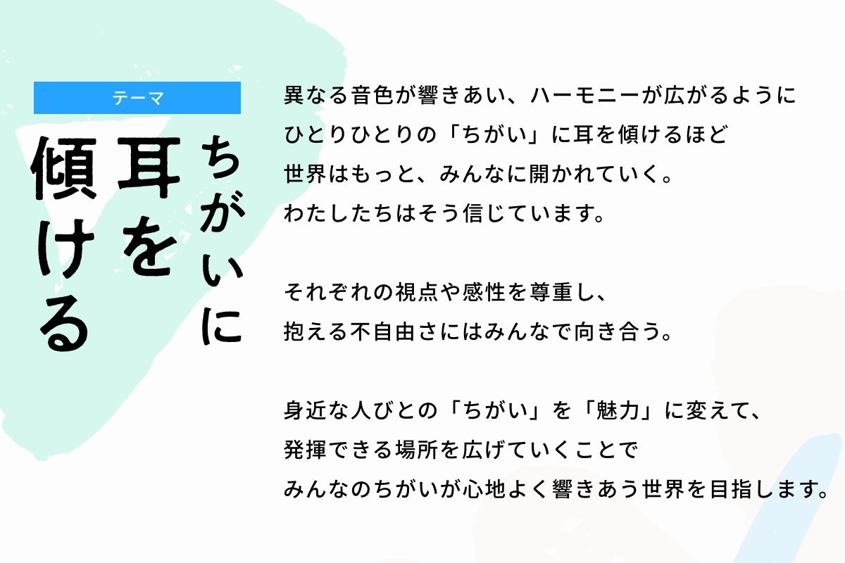 「わたしの仕事の楽しさや喜びは、どうしたら伝わるのだろう。」そう考えたときの答えの一つが、この音楽祭を一緒に楽しむことでした。ちがう、見えない、分からない。そういった壁を一つずつ緩めていき、おなじ世界の内側に入り、ひとくくりに「障害者」ではなく一人ひとりのステキな姿と出会ってもらいたい、と思ったのです。できることや生まれもったちがいが魅力になって輝いているアーティストの姿やステキな表情を沢山感じ、「君をもっと知りたい、また会いたい」と思えるようなフェスにしたいと思います。是非、この未知へのチャレンジを一緒に楽しんでください!