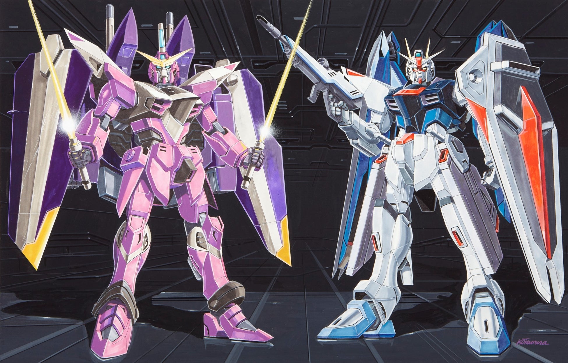 『機動戦士ガンダムSEED OFFICIAL FILE メカ編』 vol.03(講談社、2003年)掲載イラスト原画(ジャスティスガンダム、フリーダムガンダム) 大河原邦男 画