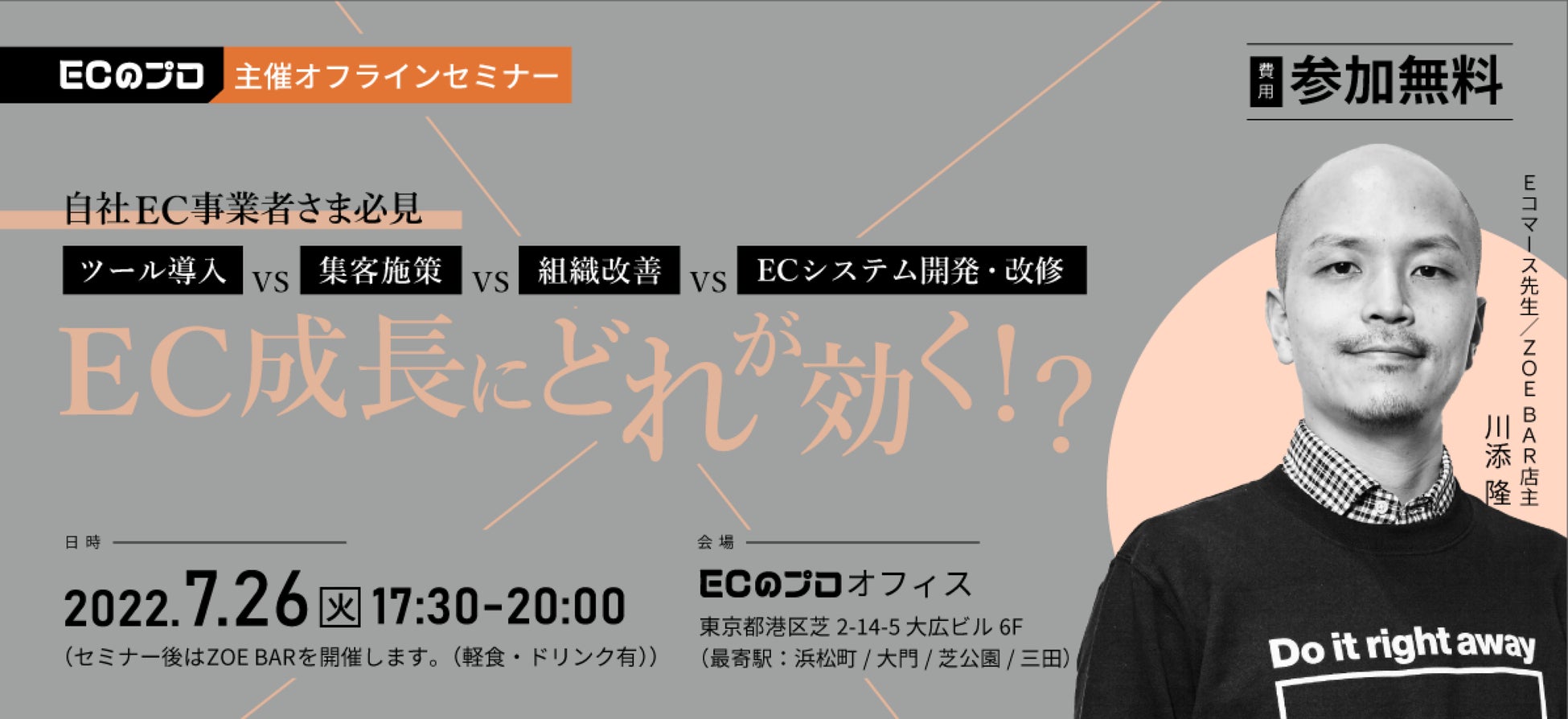 スピーカーとして、「ECのプロ」のアドバイザーであり、EC業界のトップランナーである川添 隆氏(Twitter:@tkzoe)が登壇!またセミナー終了後は、「出会いと交流の場”ZOE BAR”」を開催いたします。