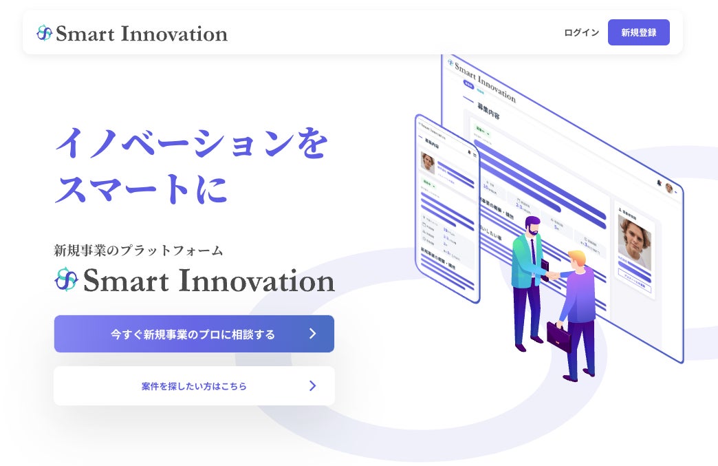 「Smart Innovation」は、新規事業のパートナーを探すためのデスクトップリサーチや商談の工数をカットし、ウェブ上で提案を集めて、優秀な新規事業パートナーとマッチングを可能にするプラットフォームです。新規事業を推進したい方々は自身の新規事業に関する悩みや目標を投稿することで、プロフェッショナルから提案を受け取り、最適なパートナーを選択することができます。