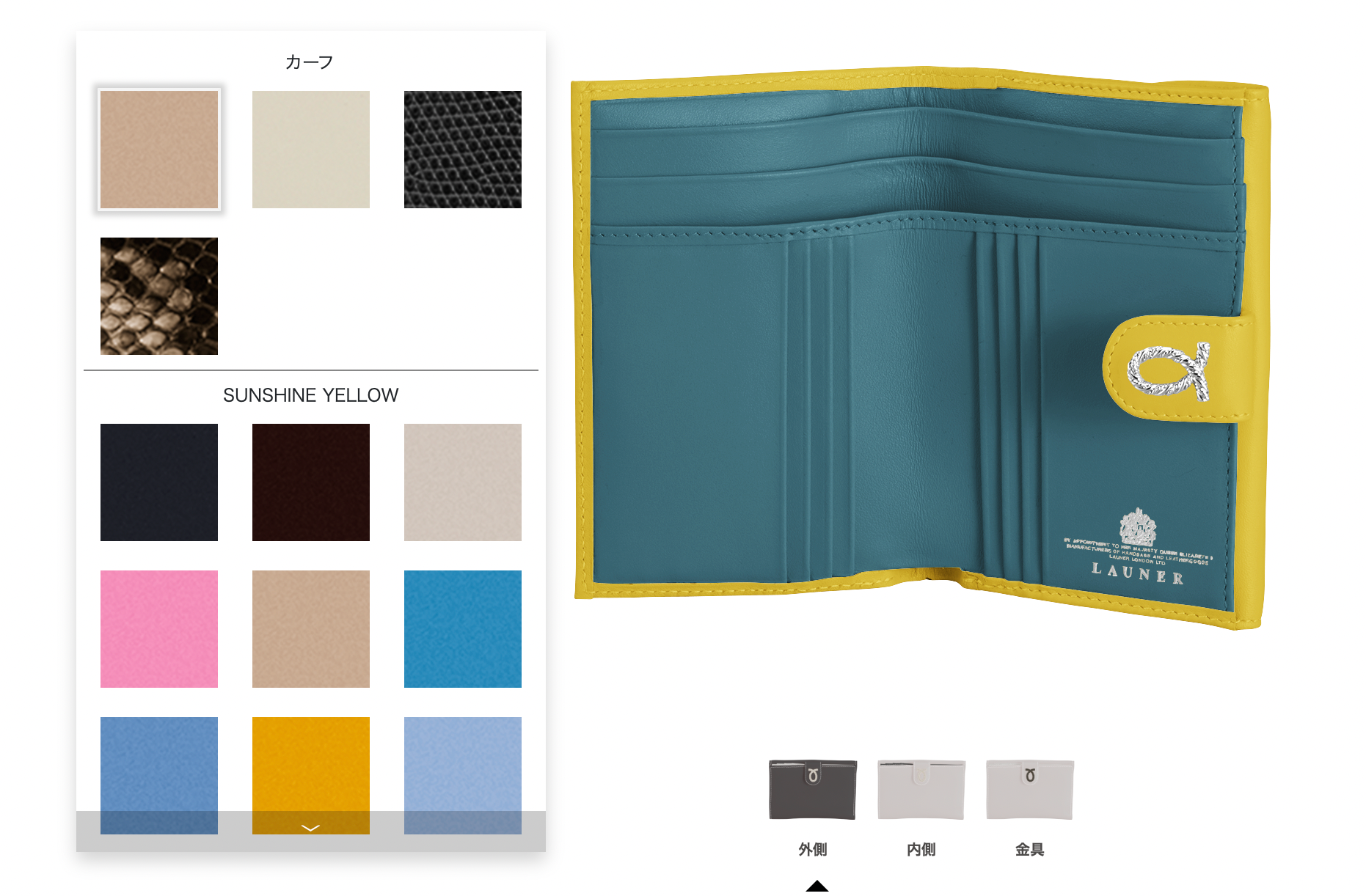 外側と内側の革色、ロゴパーツの種類などを選び、カラーシュミレーションもできます。