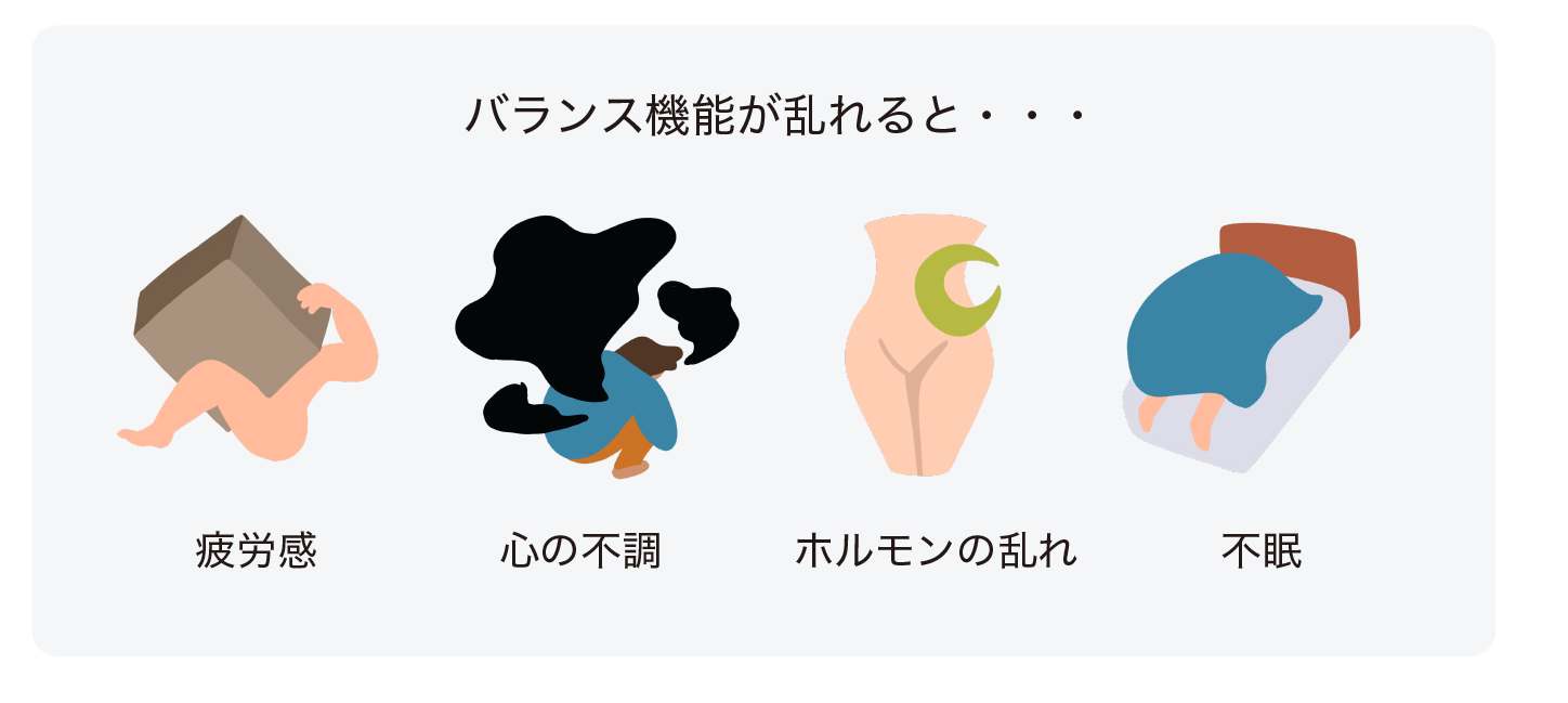 本来、人間には「バランス機能(ECS)」がそなわっており、 日々の体調や生命活動が乱れないようコントロールしています。しかし、ストレスや加齢によってその機能が下がっていきます。