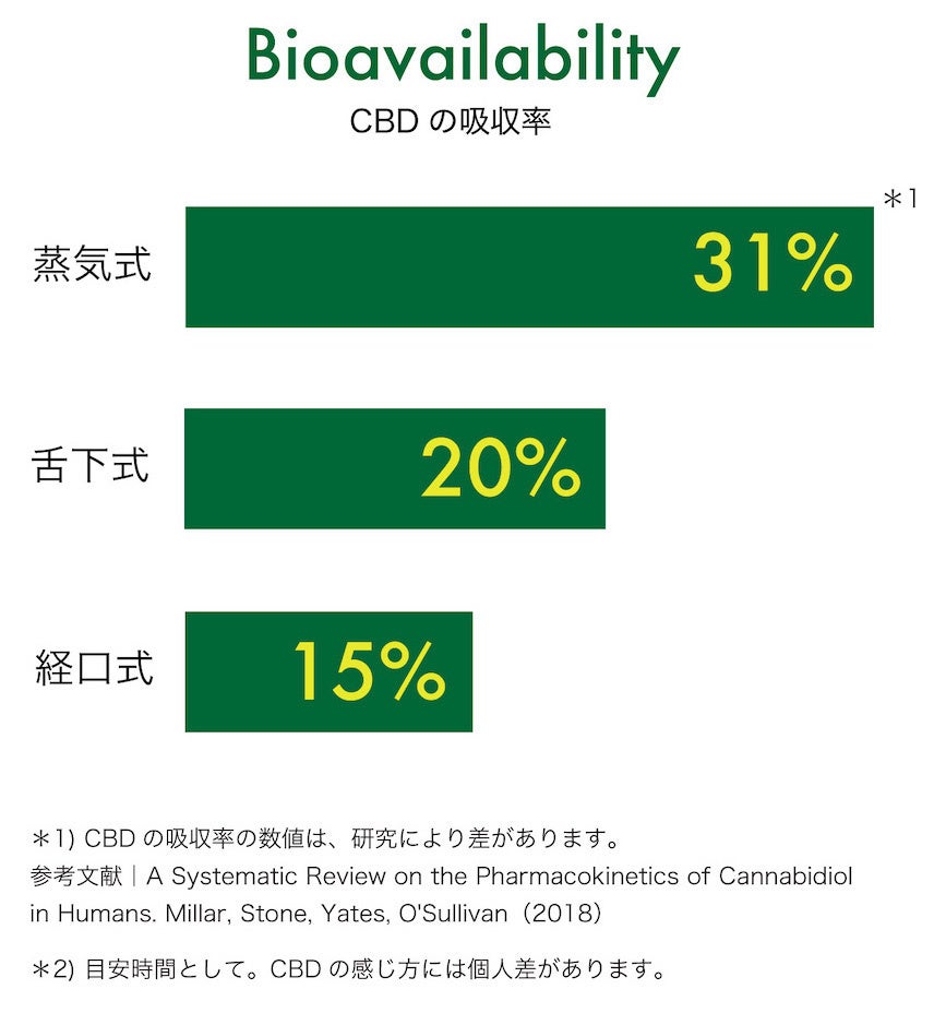 吸うCBDの特徴は、吸収率が高いこと。熱で水蒸気にしたCBDは分子が細かいため、体内への吸収が高まります。