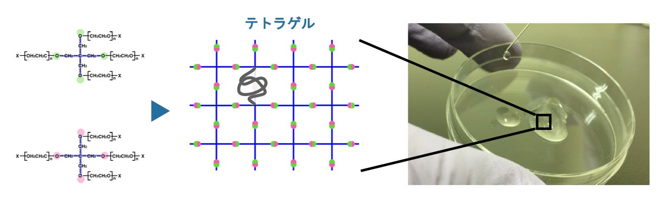 テトラゲル技術とは東京大学工学部の酒井崇匡教授が生み出した新しいゲル技術です。4分岐構造を持ち、お互いに反応する異なる末端を持つ2種類のポリマーを混ぜ合わせる事により、均一な網目構造を持ったゲルを作成することが可能です。