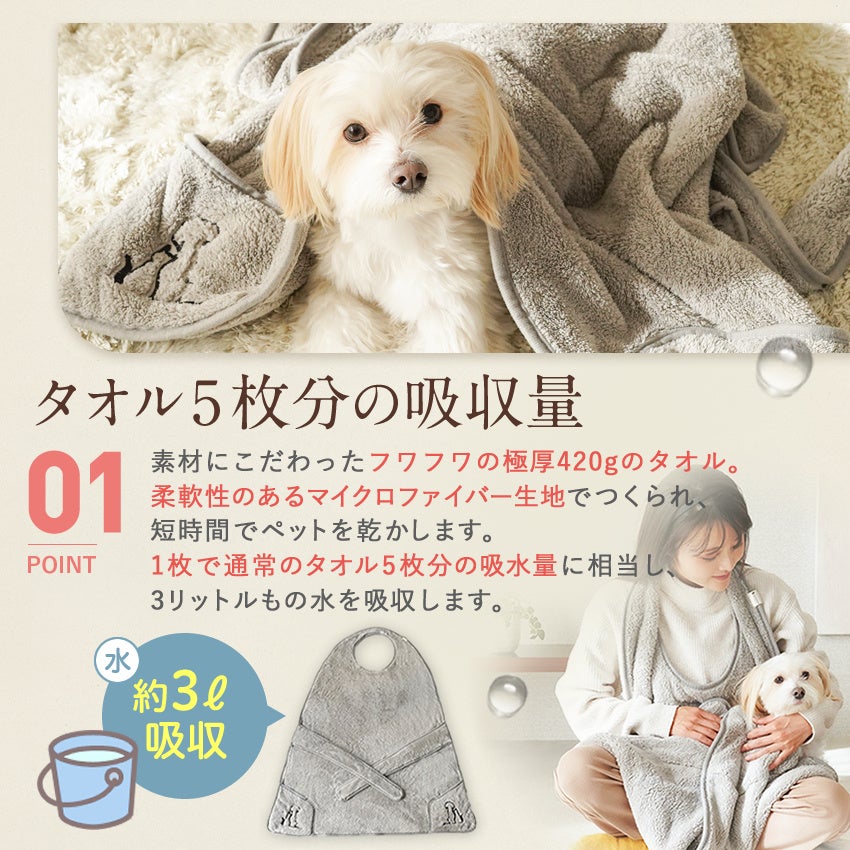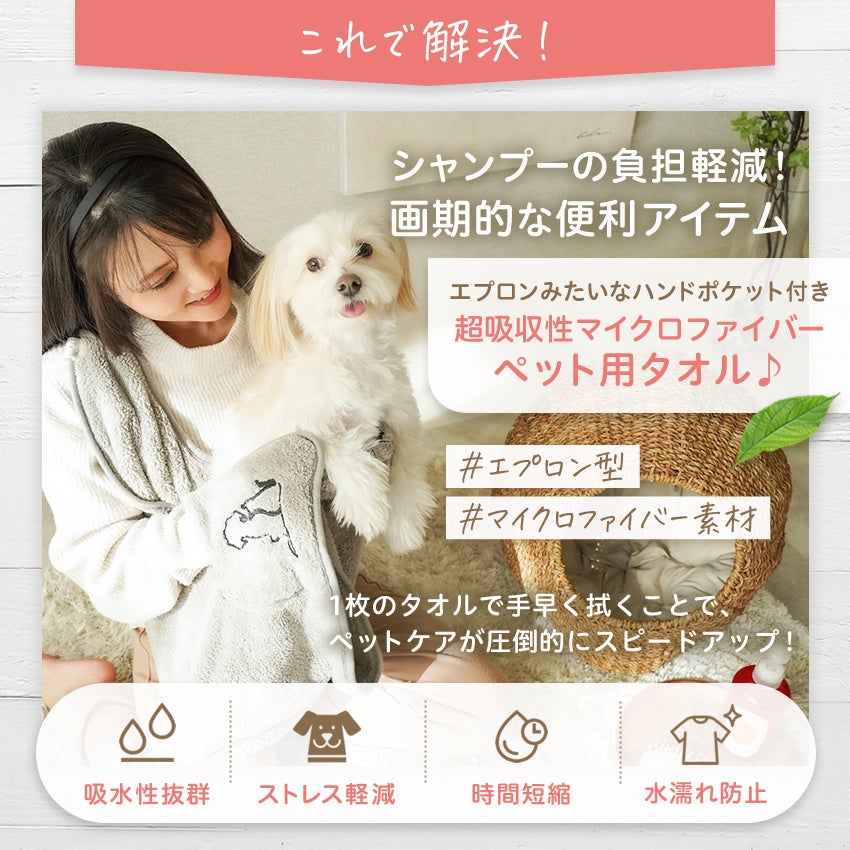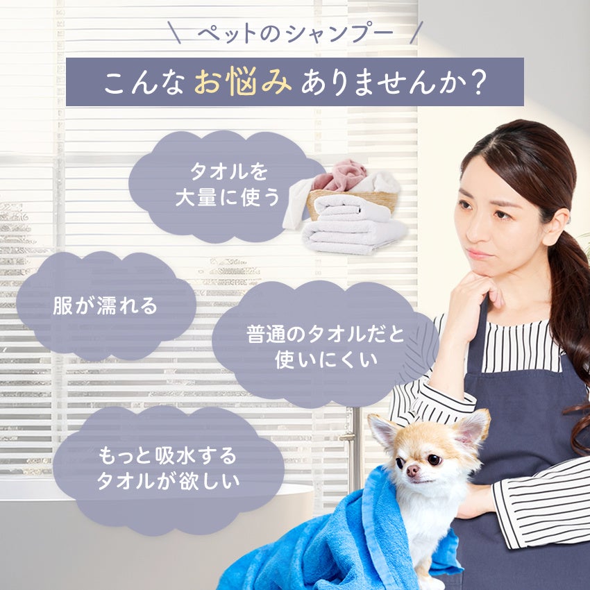 このタオルの特徴は、ペットシャンプー後のペットの乾燥に最適なマイクロファイバー生地を使用しています。マイクロファイバー生地は高い吸水性と柔軟性を持ち、たった1枚で通常のタオル5枚分の吸水力があります。