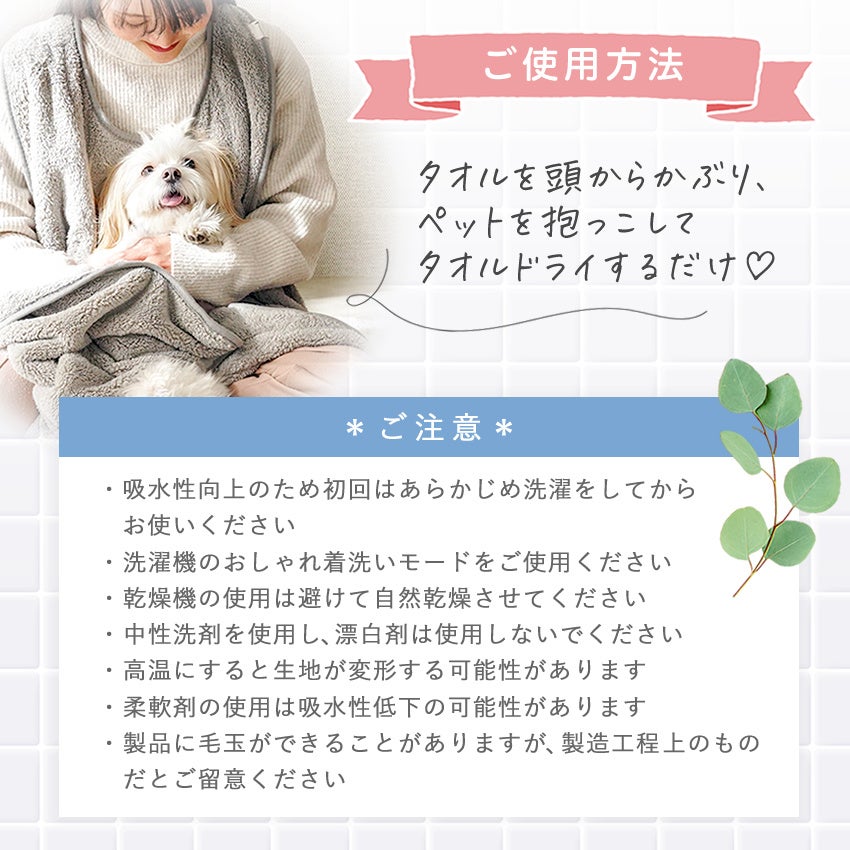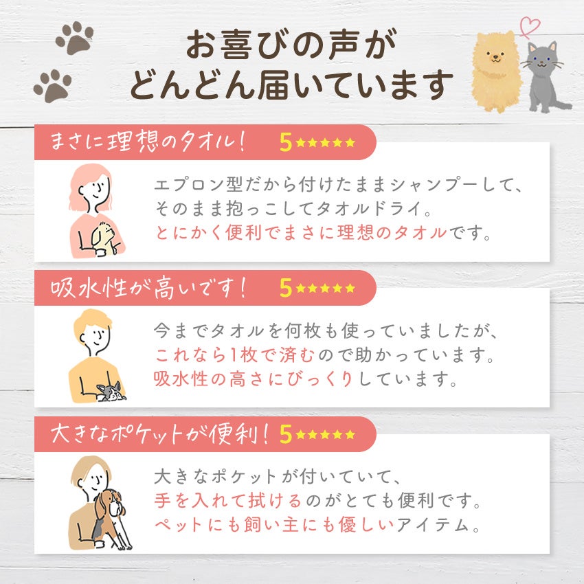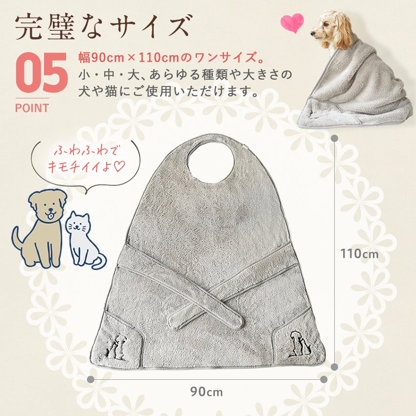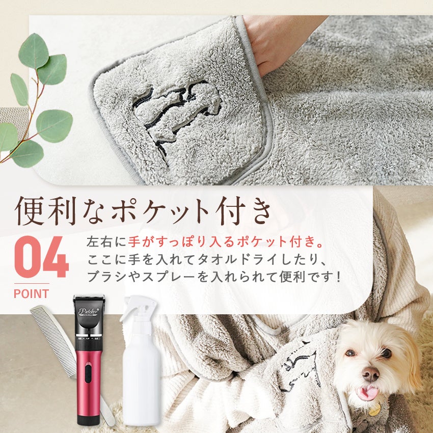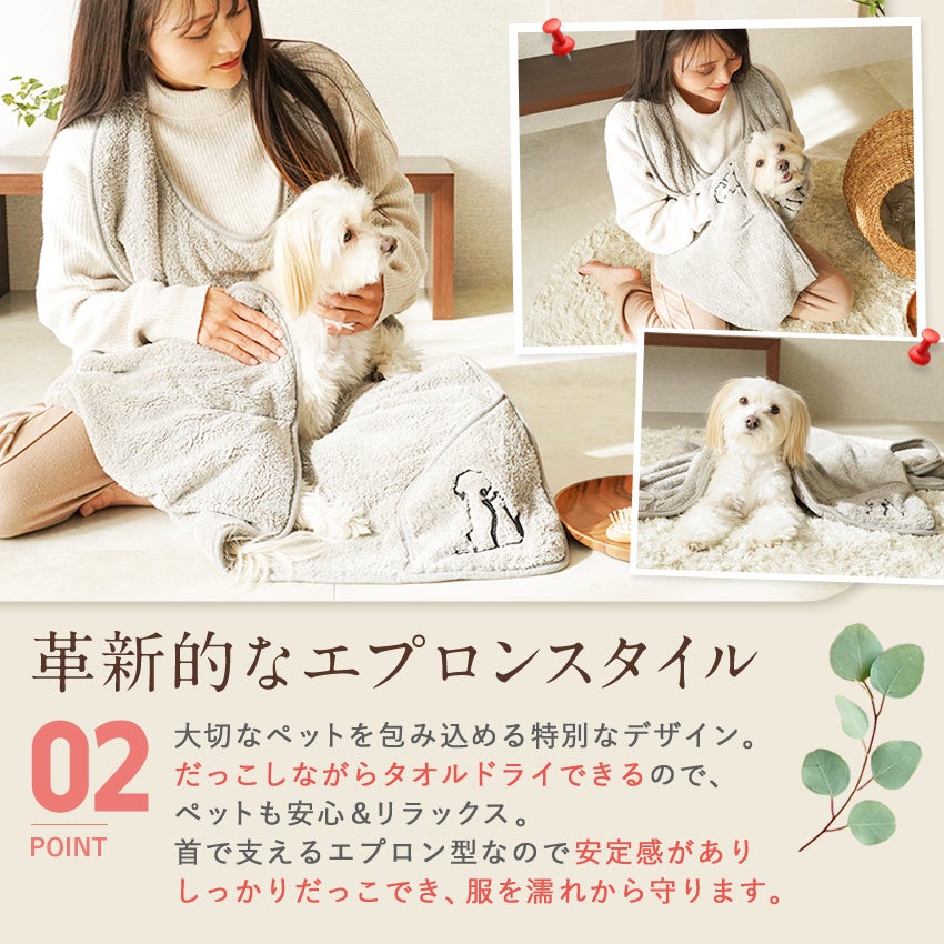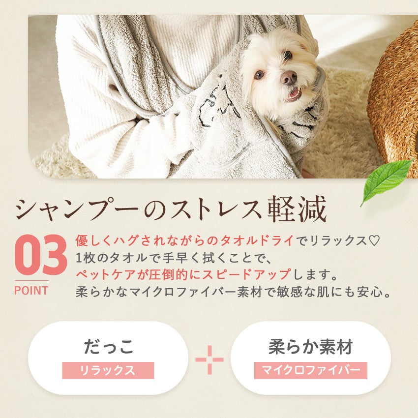 さらに、安定性を重視したデザインとホールドしやすいハンドポケットが付いており、愛犬や愛猫を抱きながら手軽に乾かすことができます。これにより、シャンプー後のストレスを軽減し、ペットに愛情を示すハグタオルとしても活用できます。