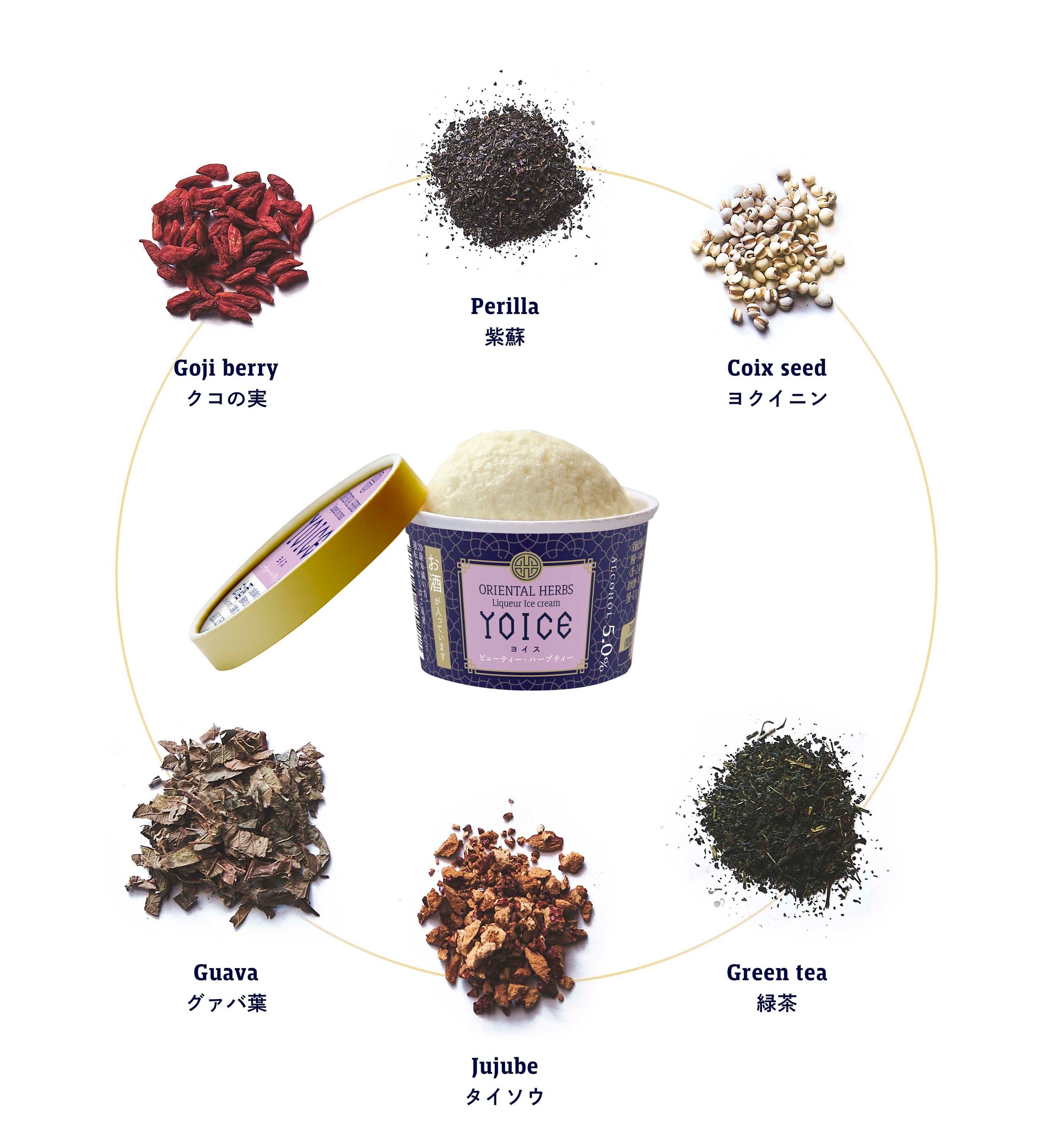 食べる美容液のようなアイスクリーム。美の万能生薬クコ、アンチエイジングのシソの葉、美肌のヨクイニン、美白のグアバ葉、保湿のタイソウ、ダイエットにもオススメの緑茶。美の漢方ハーブ5種類と緑茶を配合しています。シソの香りと緑茶の味が心地良いアイスクリームです。