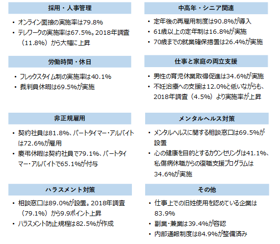 2022年調査では、企業で広く取り入れられている22分野・182の制度・施策について実施率を調べており、本リリースでは主要な19の制度・施策を紹介している。