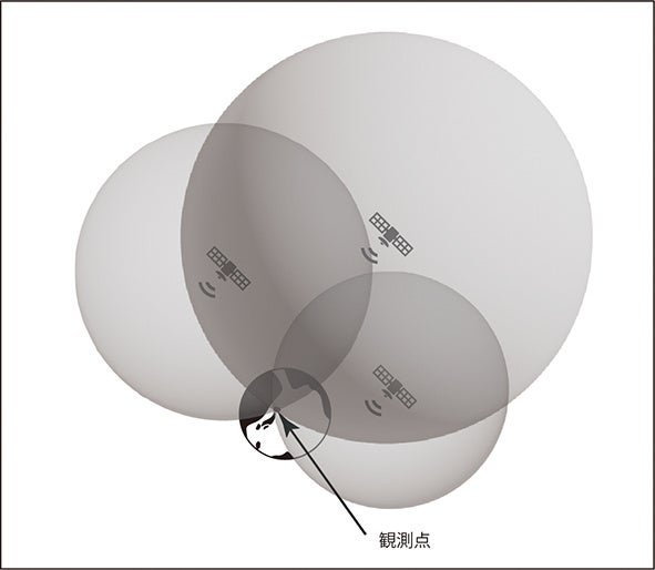 3つの衛星から受信した電波を基に求められたそれぞれの距離を半径に、衛星を中心点として描かれる3つの球面が観測地点で重なり、場所が特定されます(実際は時刻補正として4つ以上必要)。