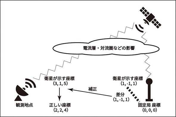 理論的には上記の通りですが、実際には上空の電離層やビルの反射波などにより、この仕組みだけでは、数メートルもの誤差が発生します。