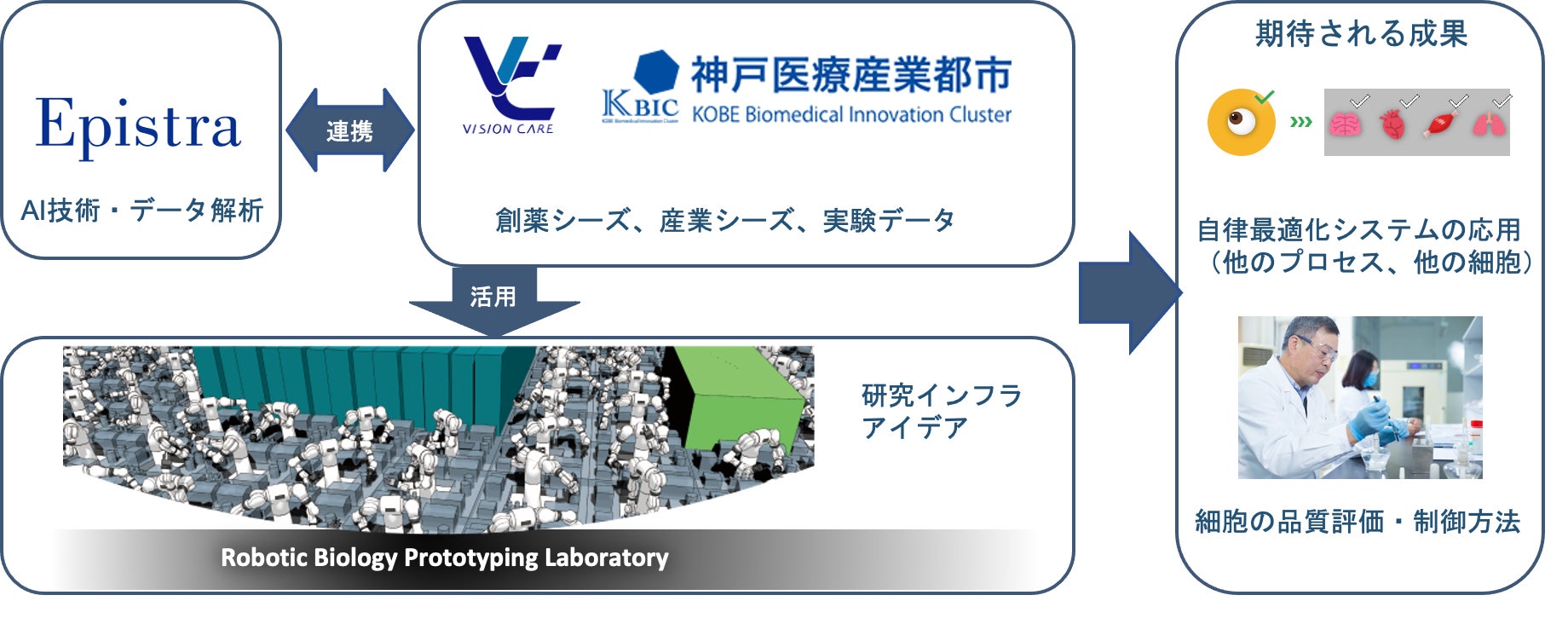 エピストラ株式会社(所在地:東京都港区、代表者:代表取締役CEO 小澤陽介、以下エピストラ)は、AIを活用して、再生医療やバイオ医薬品などの製造工程を最適化するソリューション(Epistra Accelerate)を提供しています。同ソリューションを活用した理化学研究所(以下理研) 網膜再生医療研究開発プロジェクト(研究当時)や神戸アイセンター病院との成果が今年、それぞれ国際論文誌に採択され、複数の企業への導入も進んでおり、各所で成果をあげています。今年度、神戸市に新しく開設された理研のロボティックバイオロジー・プロトタイピングラボを活用し、株式会社ビジョンケアグループをはじめとした様々な企業や研究機関と共同で、再生医療を含む生命科学の産業化をさらに推進していきます。